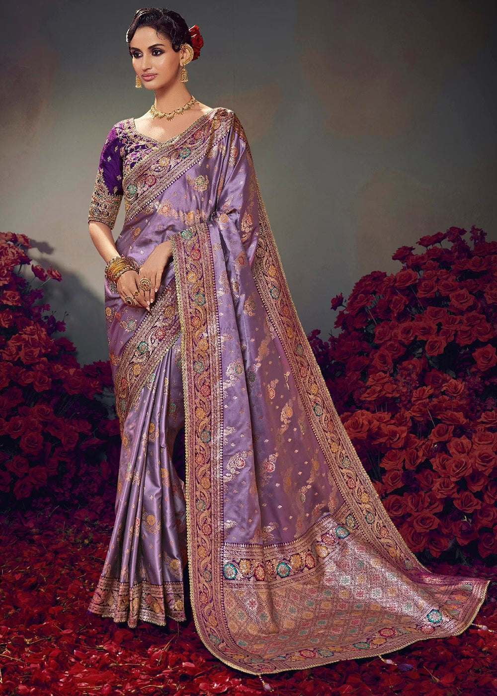 Elevate your ethnic wardrobe with this luxurious Mauve Satin-Based Saree from the Kira β Keshva...
