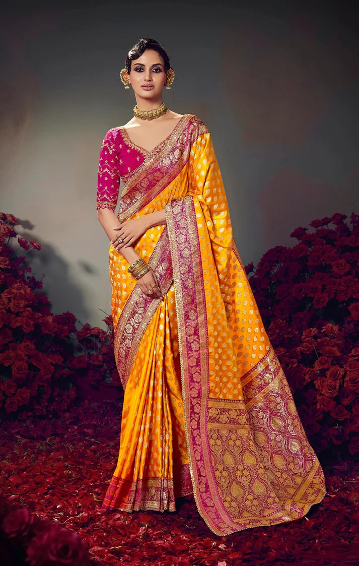 Keshva Silk Yellow Satin-Based Saree with Lace Border & Heavy Embroidered Contrast Blouse