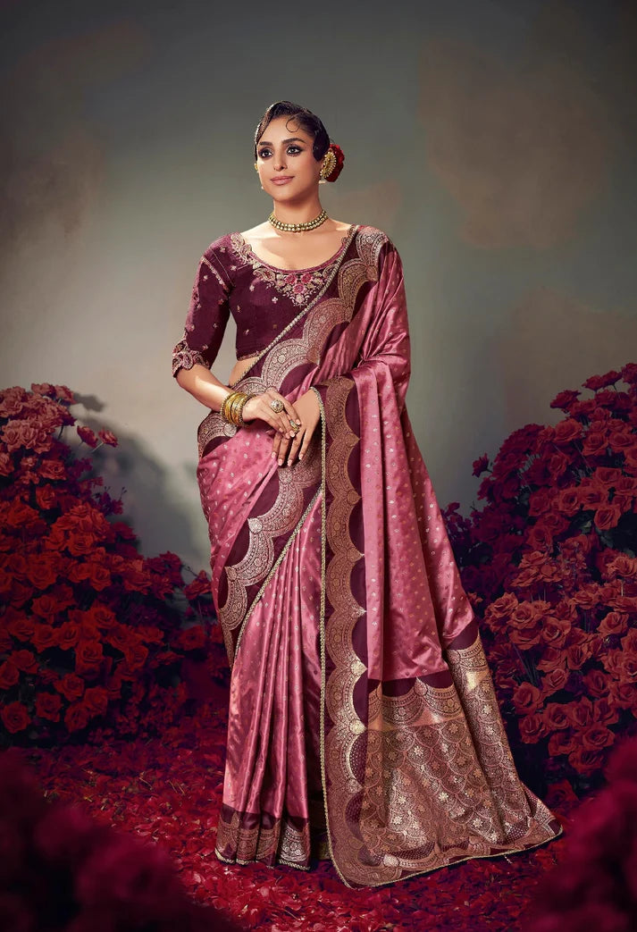 Keshva Silk Mauve Satin-Based Saree with Lace Border & Heavy Embroidered Contrast Blouse