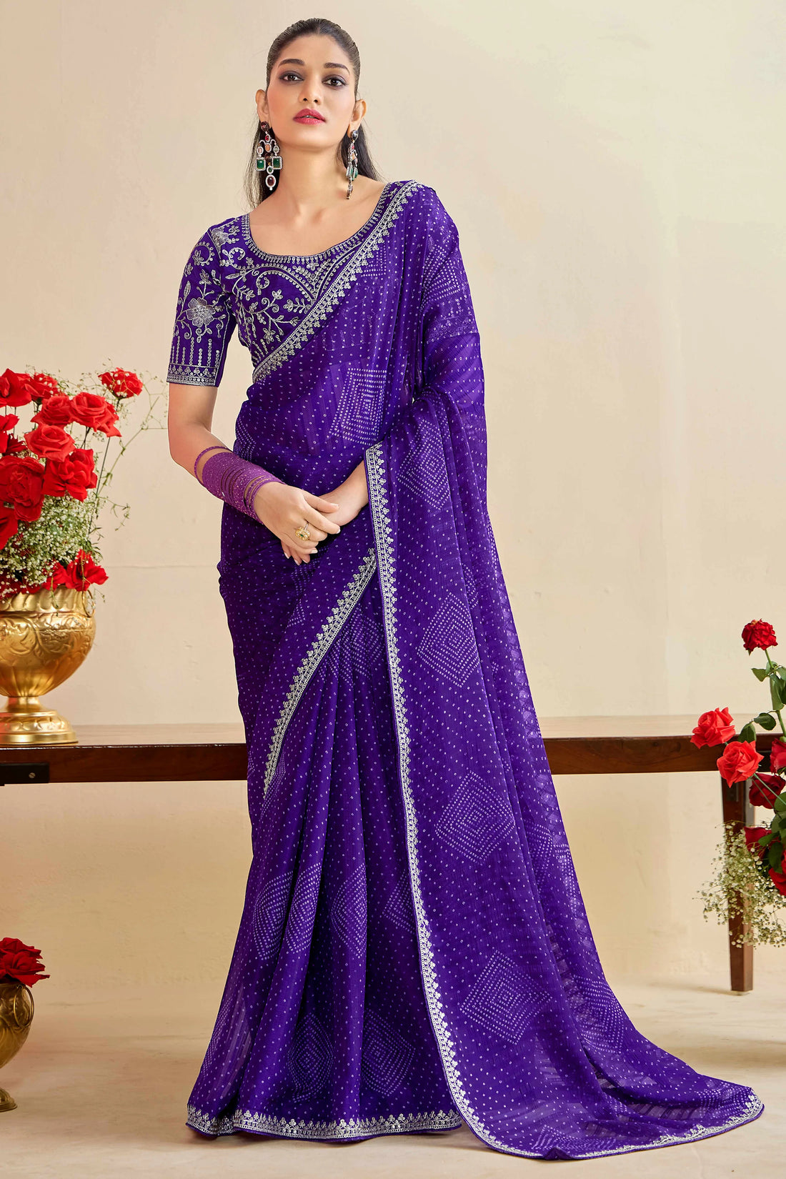 Elevate your ethnic charm with this Royal Purple Bandhniya Saree from Stavan. Crafted in premium...