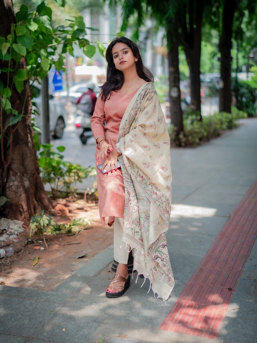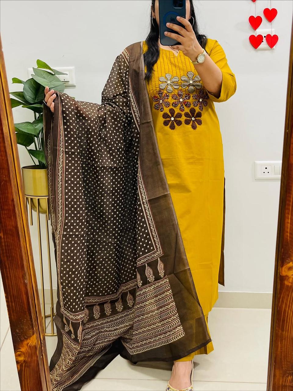 South Cotton Kurti Set with Cotton Slub Pants & Khadi Silk Dupatta