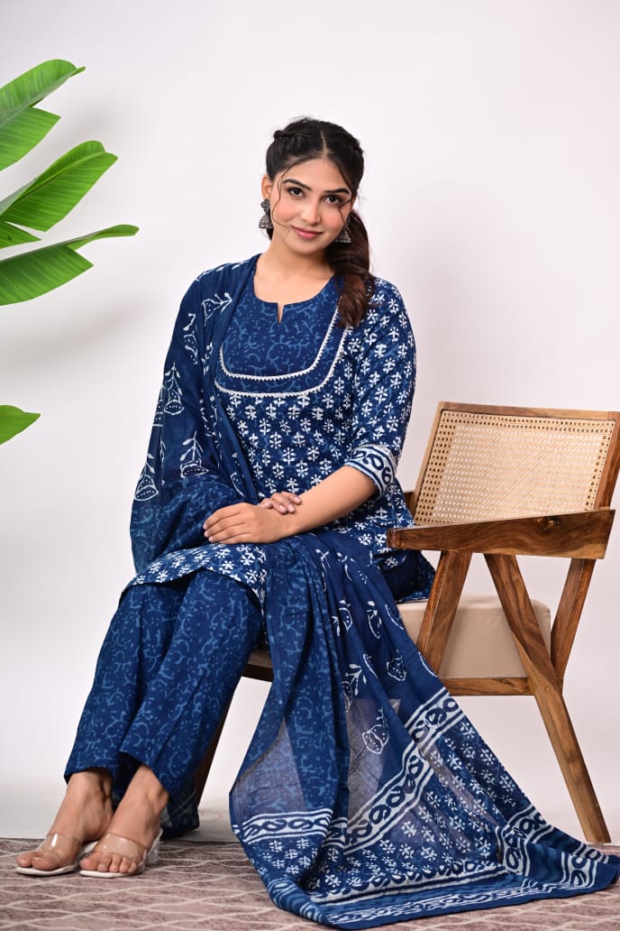Hand Block Printed Stitched Cotton Suit Set with Matching Cotton Dupatta