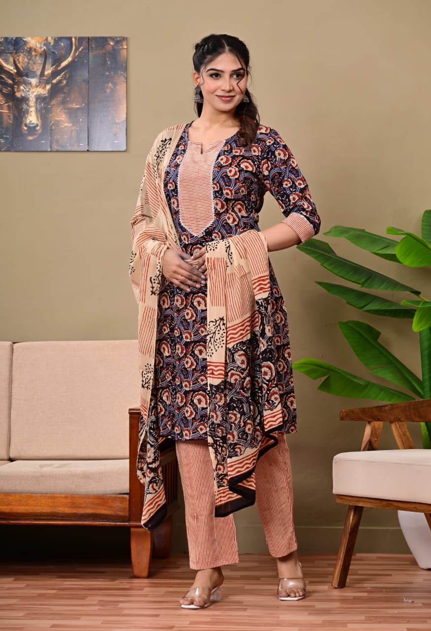 Premium Dhabu Cotton Embroidered A-Line Suit Set with Ajrakh Dupatta