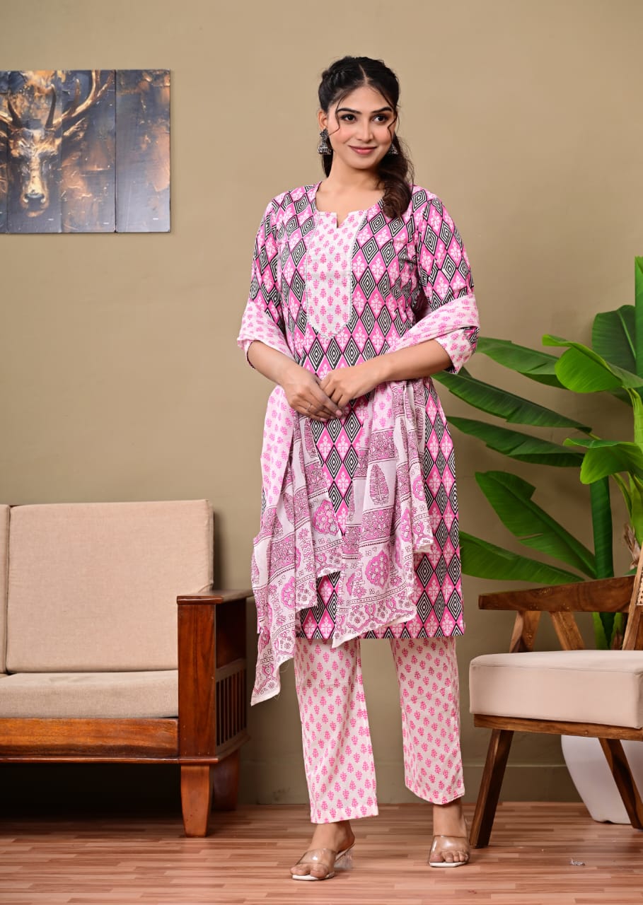 Pure Cotton Printed Kurti Set with Embroidery, Pant & Mulmul Dupatta |