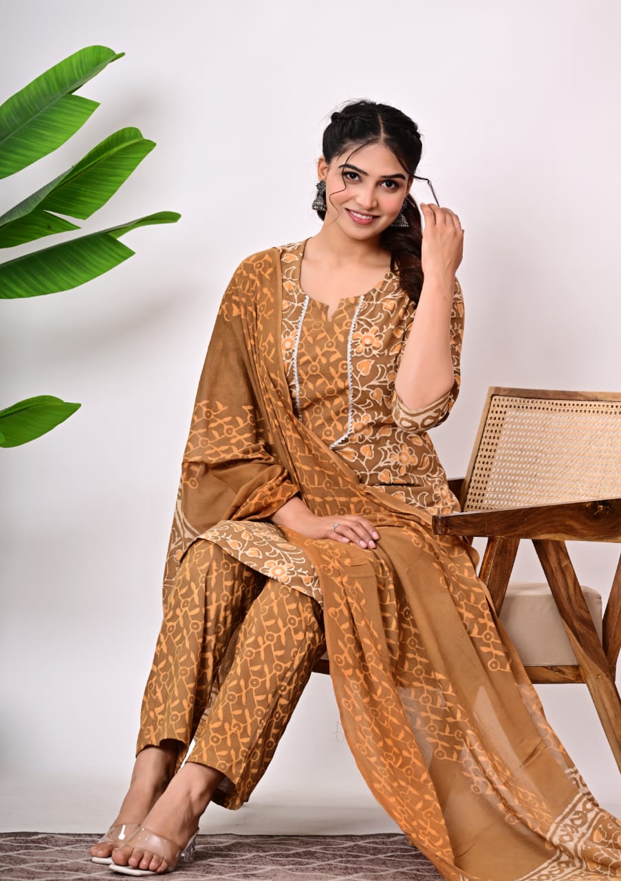 Hand Block Printed Stitched Cotton Suit Set with Matching Cotton Dupatta