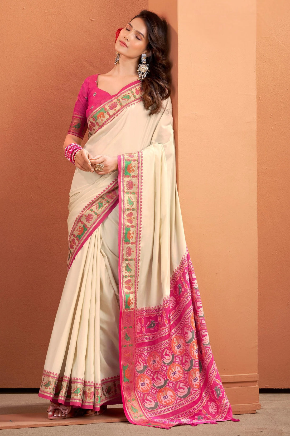 Drape yourself in timeless elegance with this VRUNDAVN Cream Patola Silk Saree from RajPath Fabrics....
