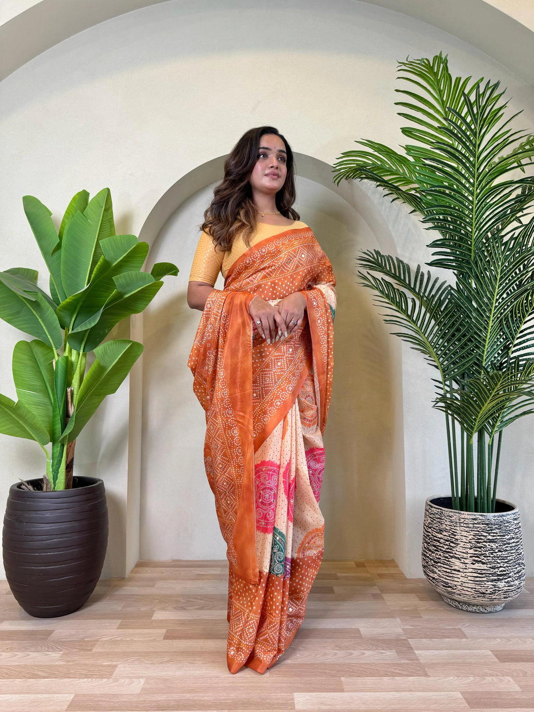 Kesariyaa Bandhani Print Orange Tissue Silk Weaving Saree