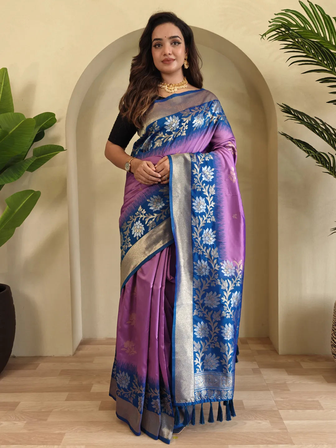 Β This stunning Violet Purple dual-tone silk saree is richly designed with all-over elegant zari...