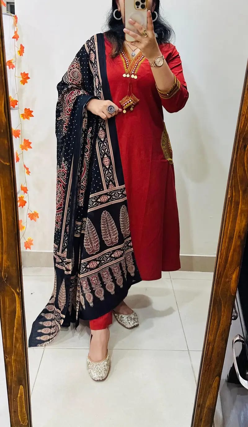 Premium Dhabu Cotton Embroidered A-Line Suit Set with Ajrakh Dupatta