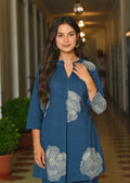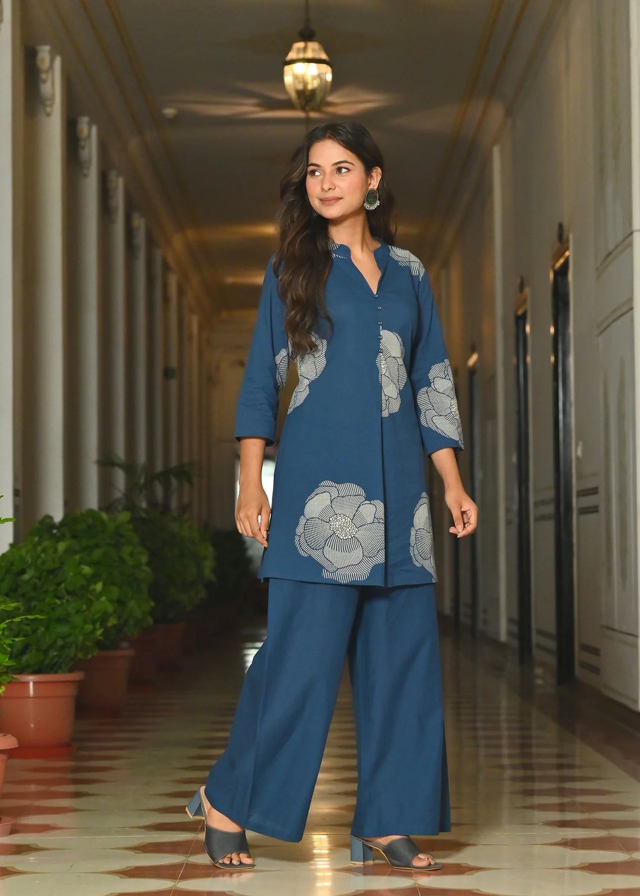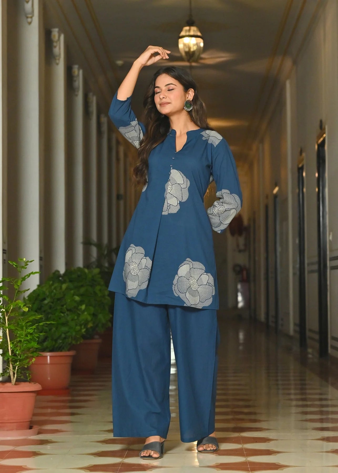 Stay effortlessly chic with this Blue Floral Printed Co-Ord Set, designed in soft pure cotton for maximum comfort. The elegant floral motifs bring a refreshing vibe, making it your go-to outfit for brunches, casual office wear, or festive get-togethers. A perfect mix of style and ease for the modern woman.