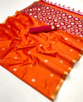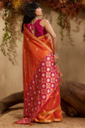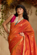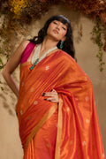 The warm bronze-orange hue exudes festive richness while maintaining a graceful sophistication, making this saree an exquisite choice for weddings, cultural celebrations, and special occasions where tradition meets luxury.
