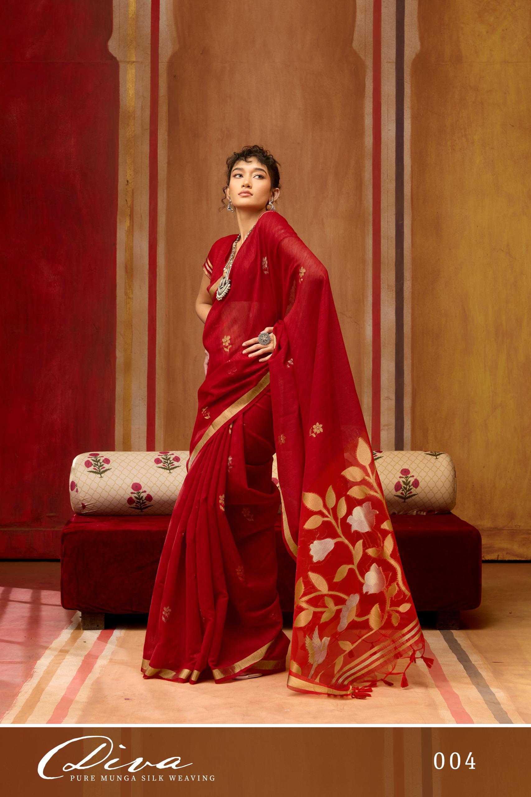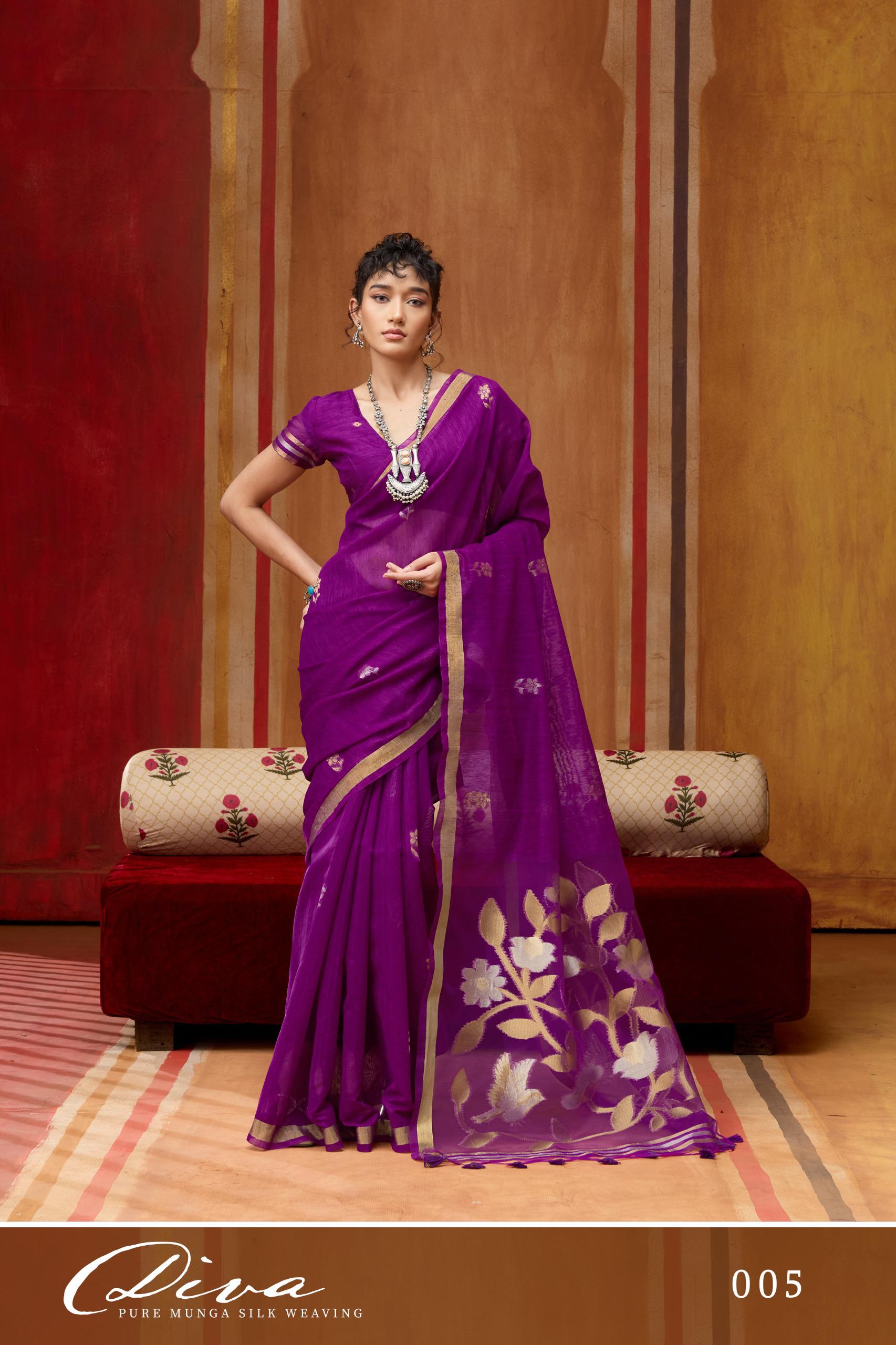 Elegant DIVA catalogue, this Pure Munga Silk handloom saree is a celebration of refined craftsmanship and timeless luxury. Woven with precision, the saree features the natural richness of Munga silk, known for its subtle sheen and graceful texture.
