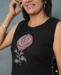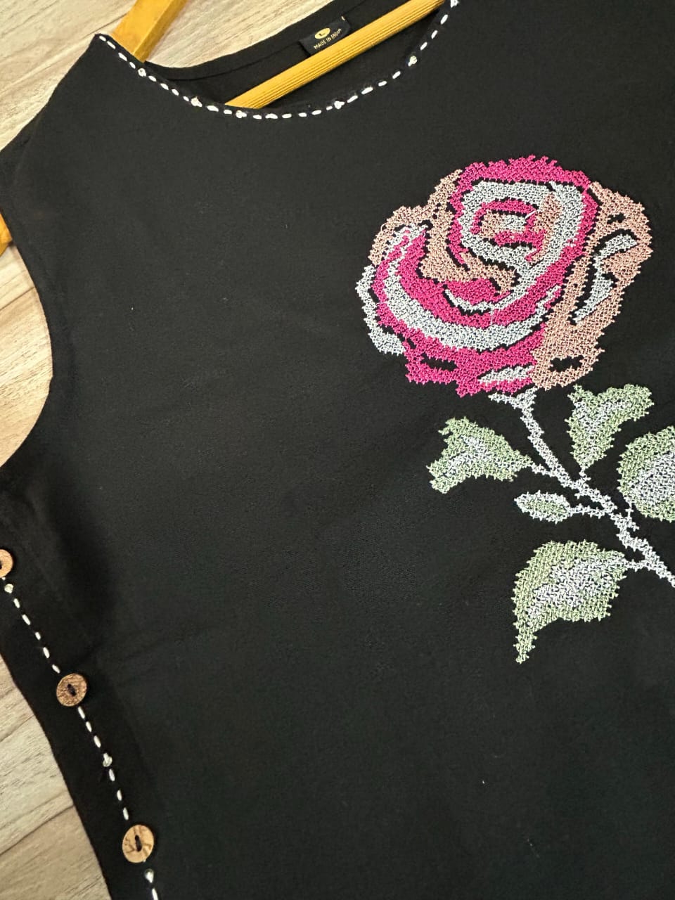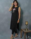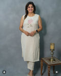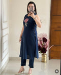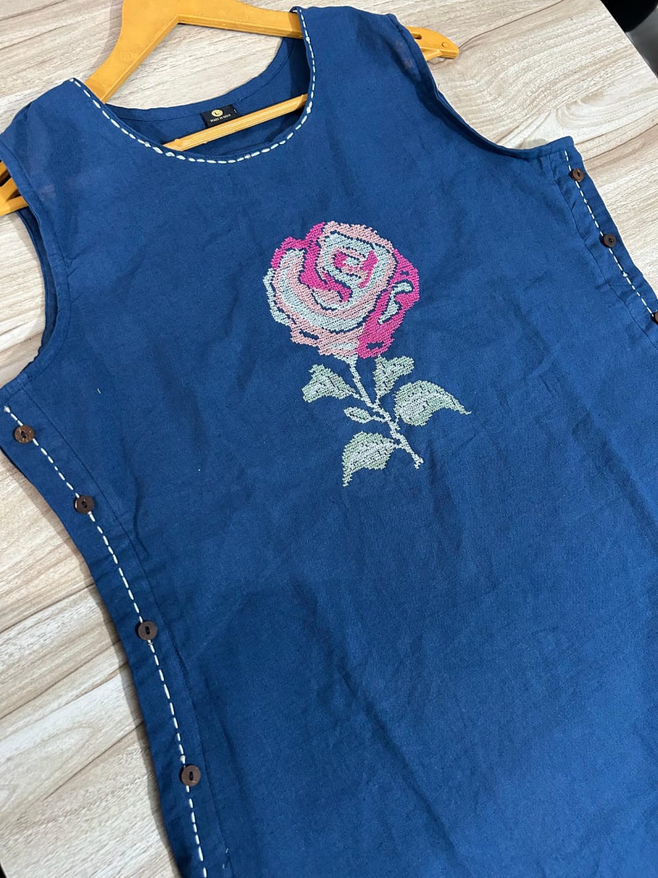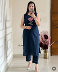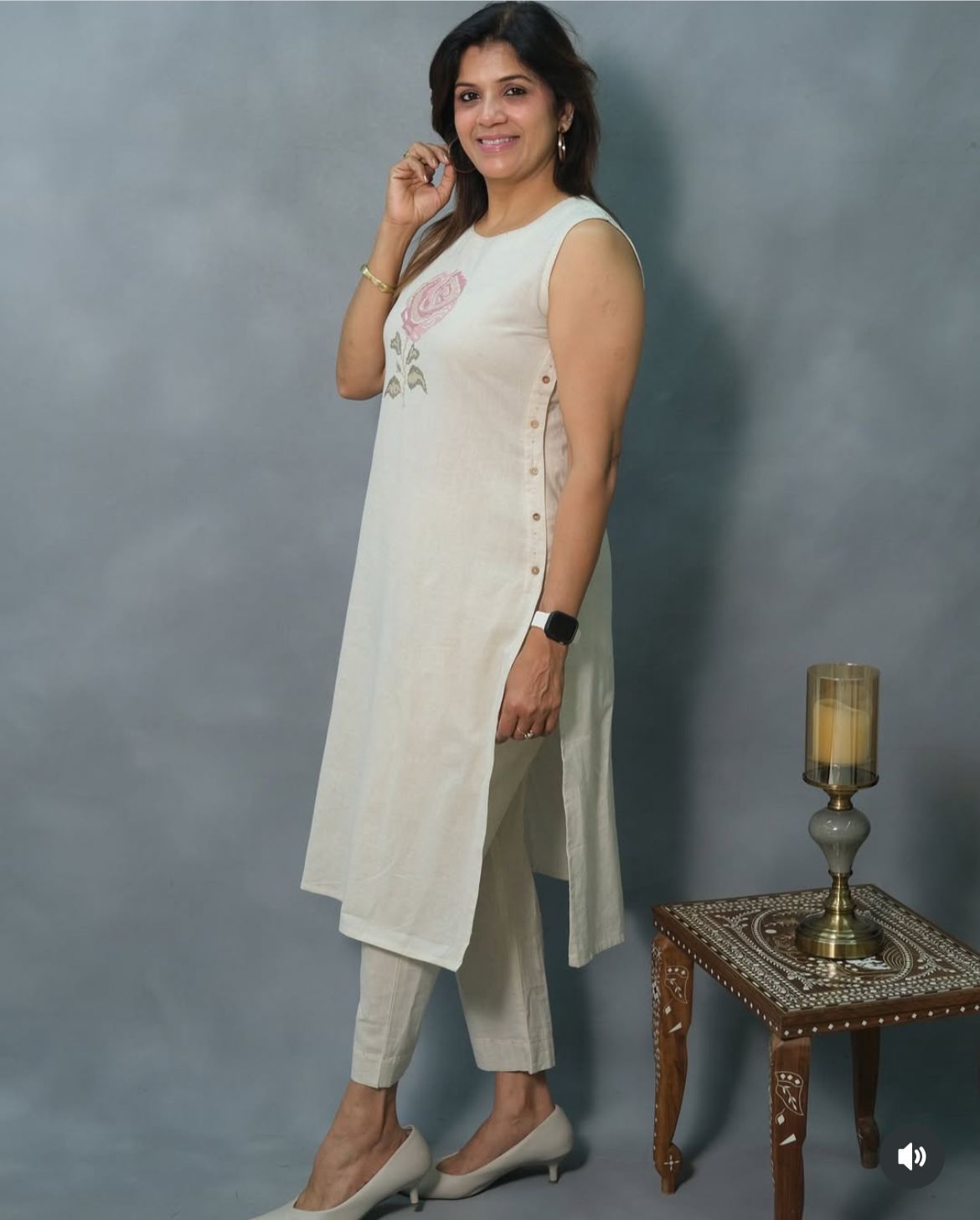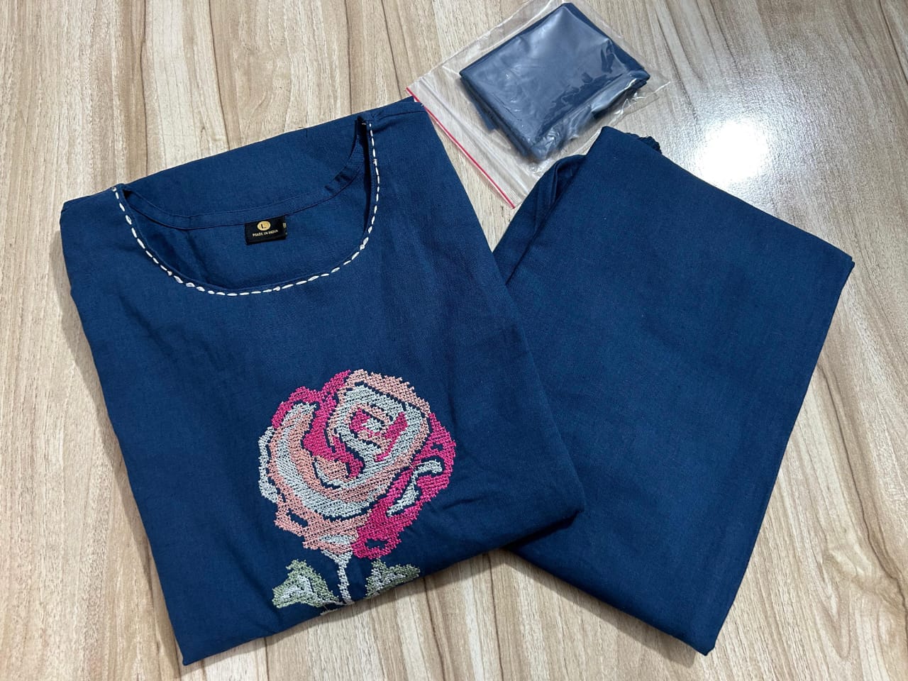 Effortlessly chic and comfortable, this embroidered kurti with pant set is crafted in breathable cotton flex fabric. The kurti features delicate embroidery that adds a touch of elegance, while the matching pants come with handwork detail and a practical side pocket for everyday ease. Designed for comfort and style, this set is perfect for casual outings, workdays, or festive gatherings.