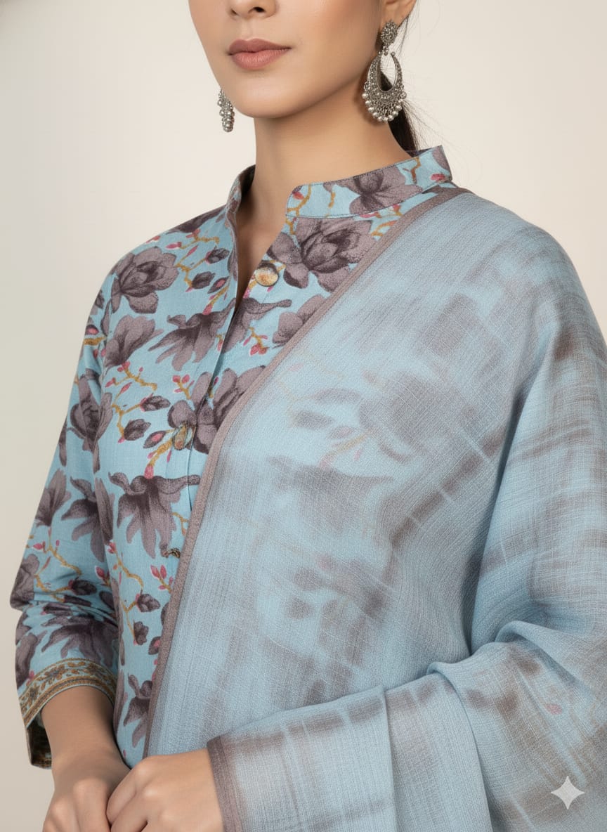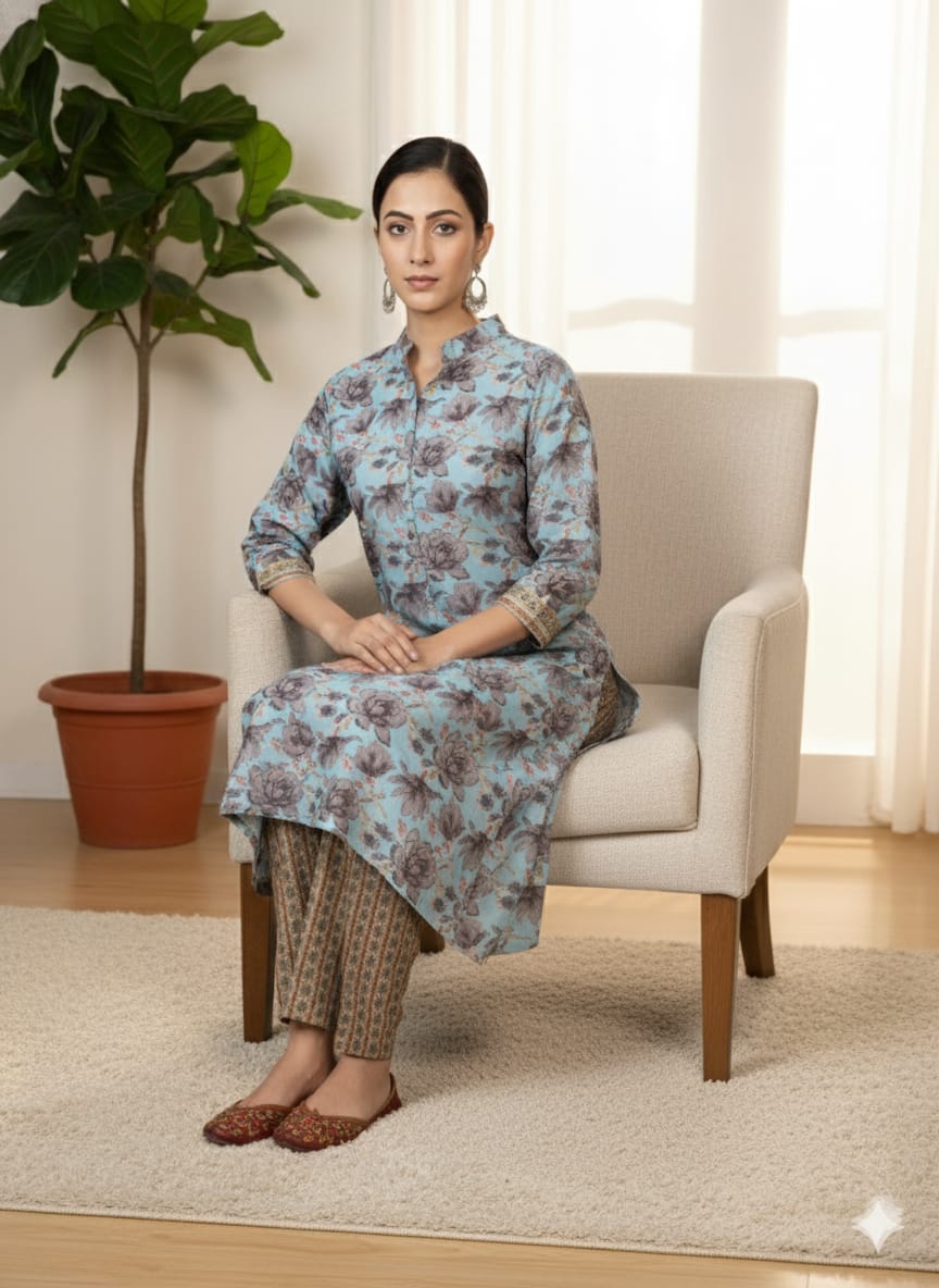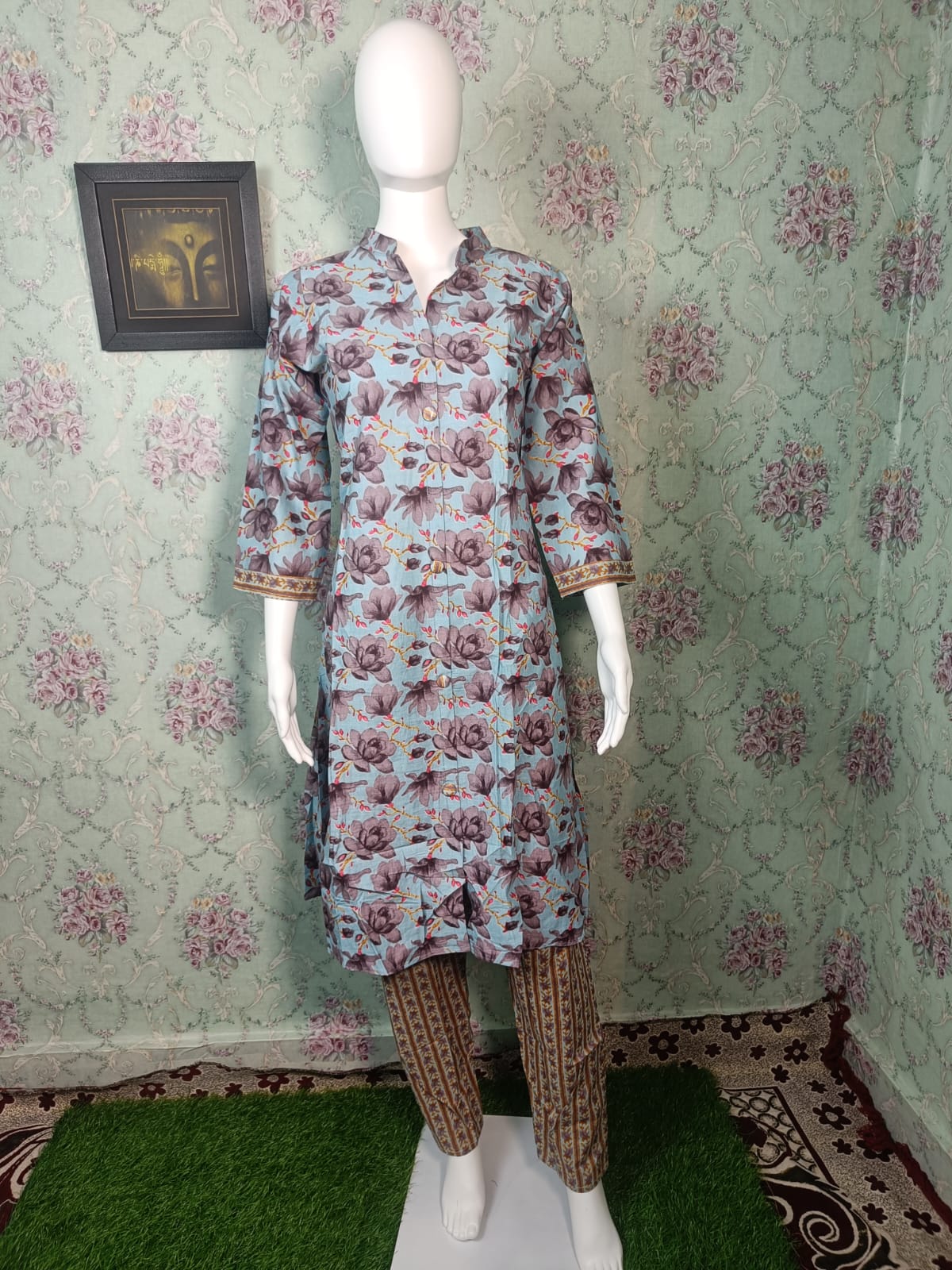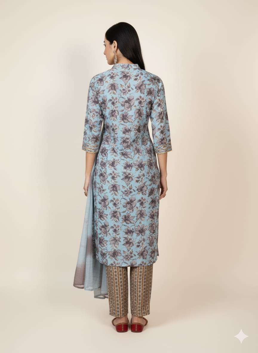 Stay effortlessly elegant with the Faddism Floral Kurti Pant Set, crafted from soft, breathable cotton and paired with a flowy chiffon dupatta. Designed with a stand collar and center slit cut, this outfit offers the perfect mix of comfort and modern ethnic charm. Ideal for office wear, casual outings, and day gatherings, it’s a wardrobe essential for women who love subtle sophistication.