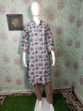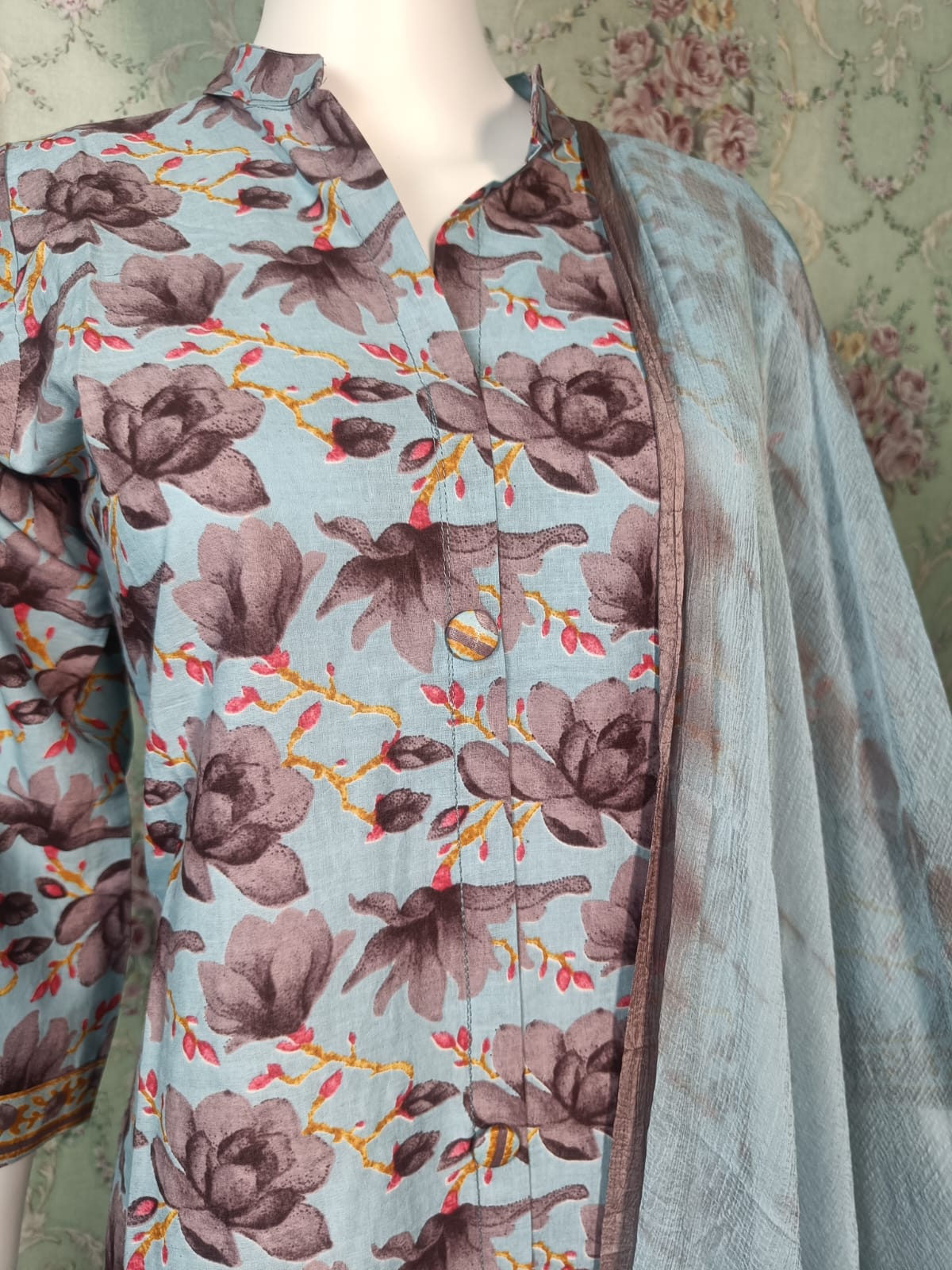 Faddism Floral Cotton Kurti Pant Set with Chiffon Dupatta – Stylish Stand Collar & Center Slit Design