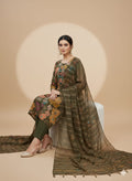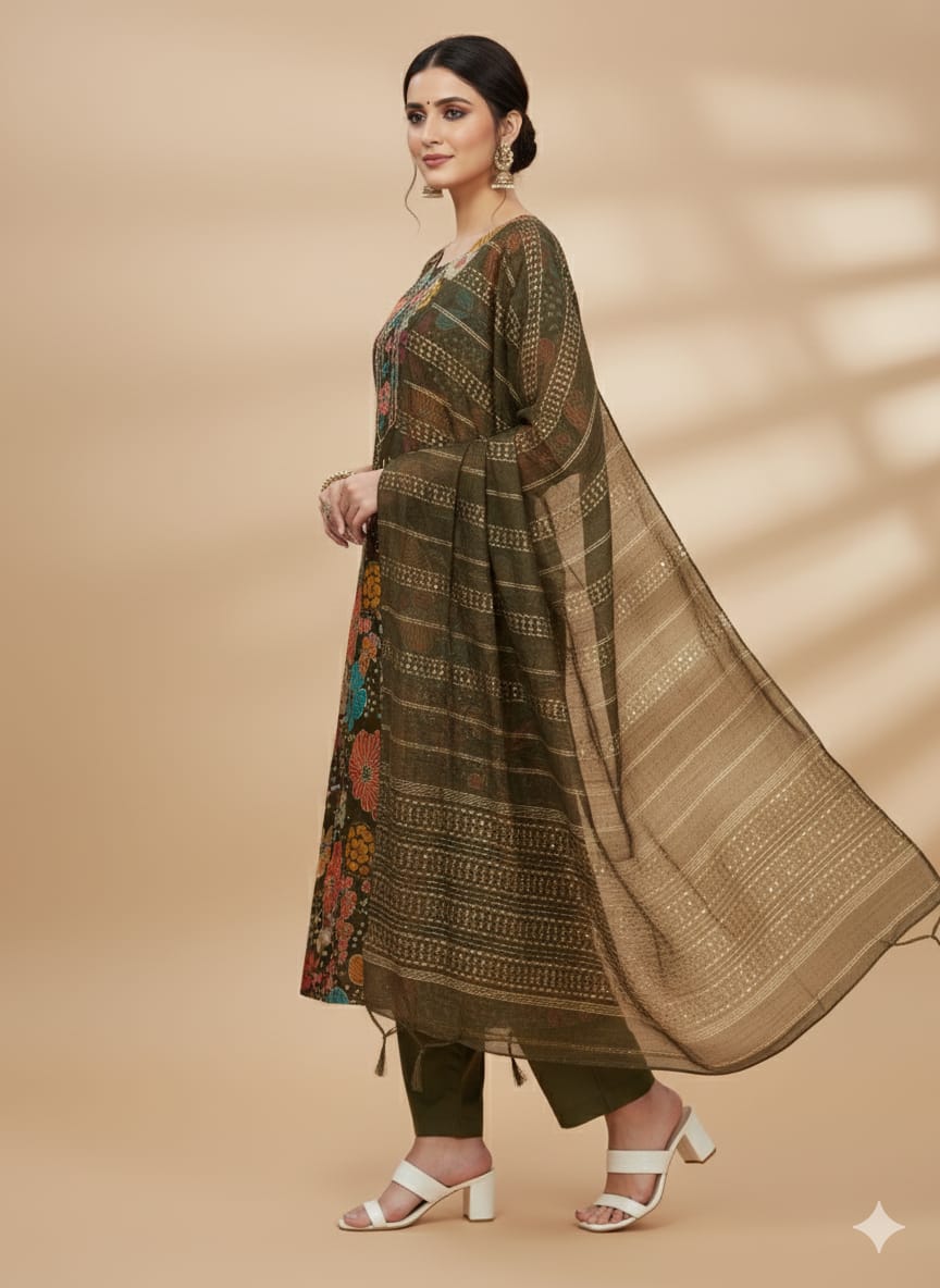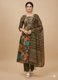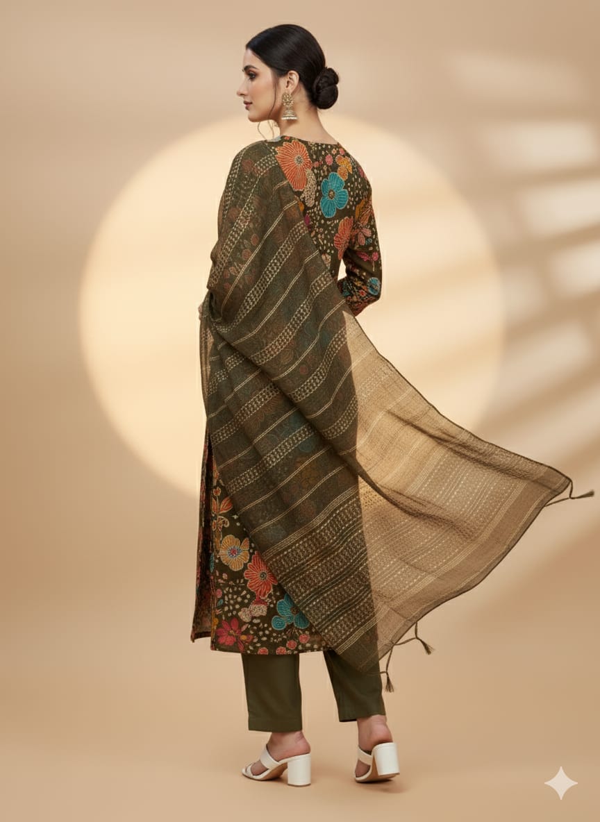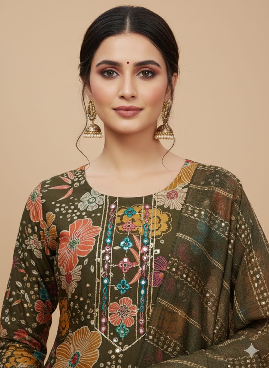 Faddism Floral Elegance Mehendi Modal Silk Kurta Pant Dupatta Set with Foil & Gota Patti Work