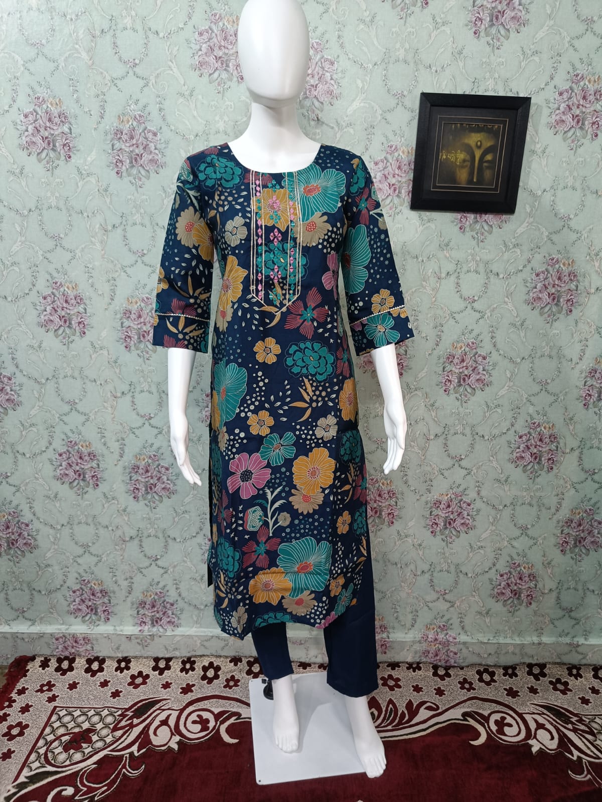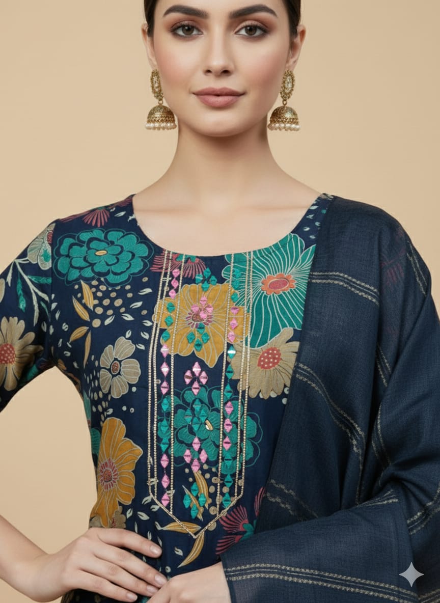 Embrace elegance with this Faddism Floral Elegance Kurta Set in a rich navy blue shade. Crafted in Modal Silk Kurti & Pant with a soft Cotton Dupatta, the outfit is beautifully adorned with Foil & Gota Patti detailing for a festive shimmer. The kurta comes with an attached cotton lining inside, offering comfort, structure, and a smooth drape. Designed with a 44" kurti (3/4th sleeves) and 39" pant, this ensemble is a versatile choice for office wear, kitty parties, festive occasions, and cultural gatherings. Available in sizes M to XXL for a flattering fit.