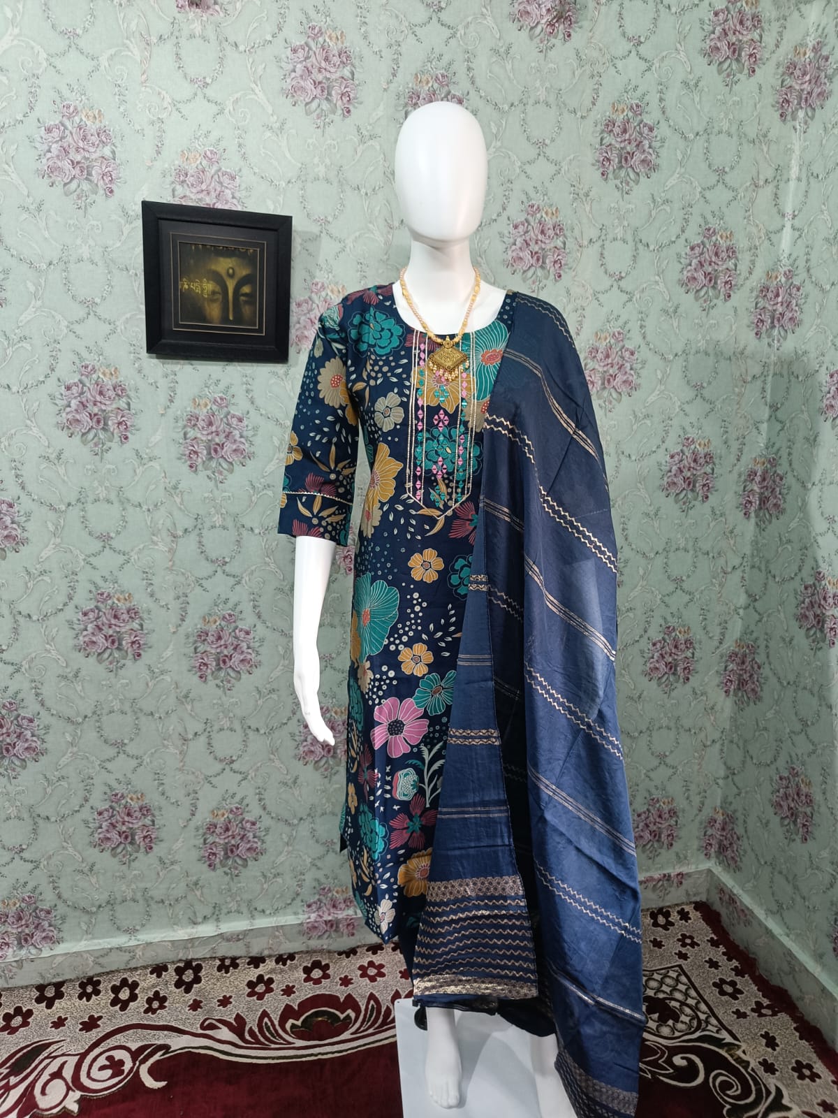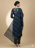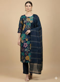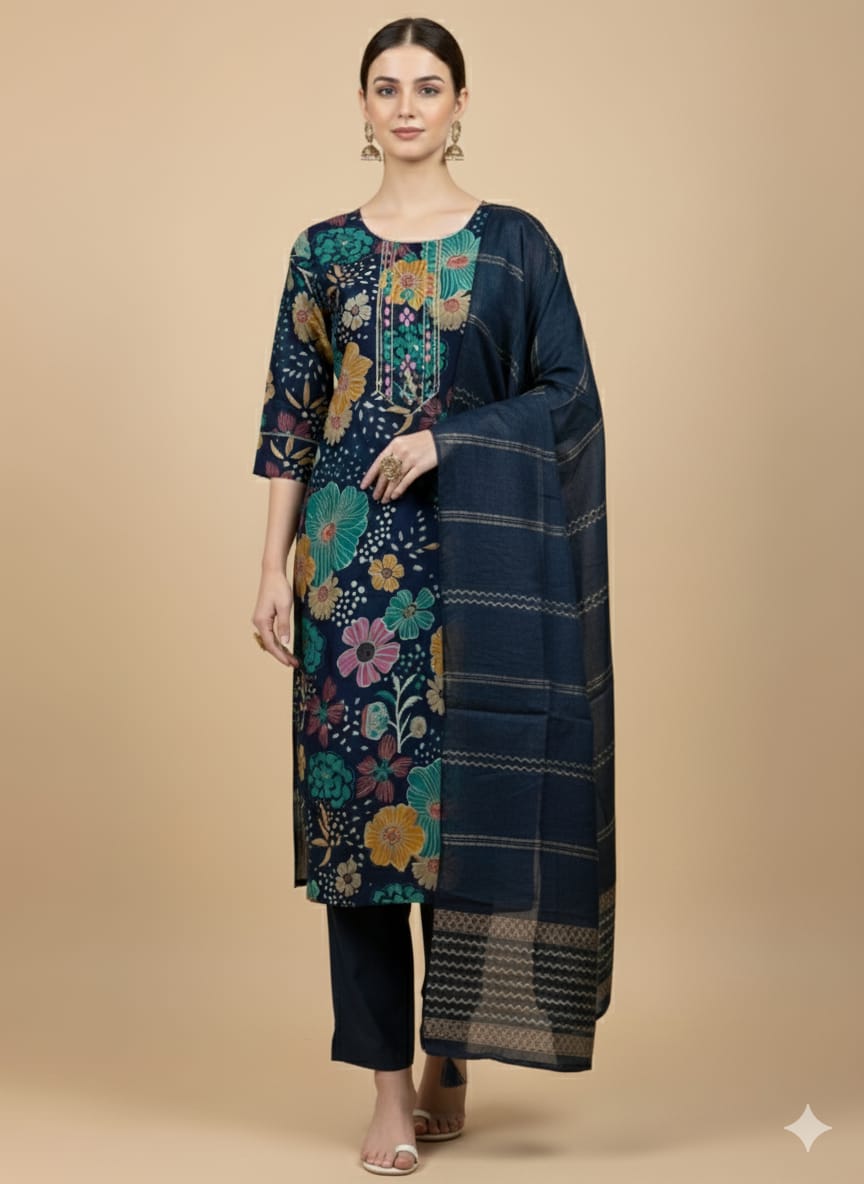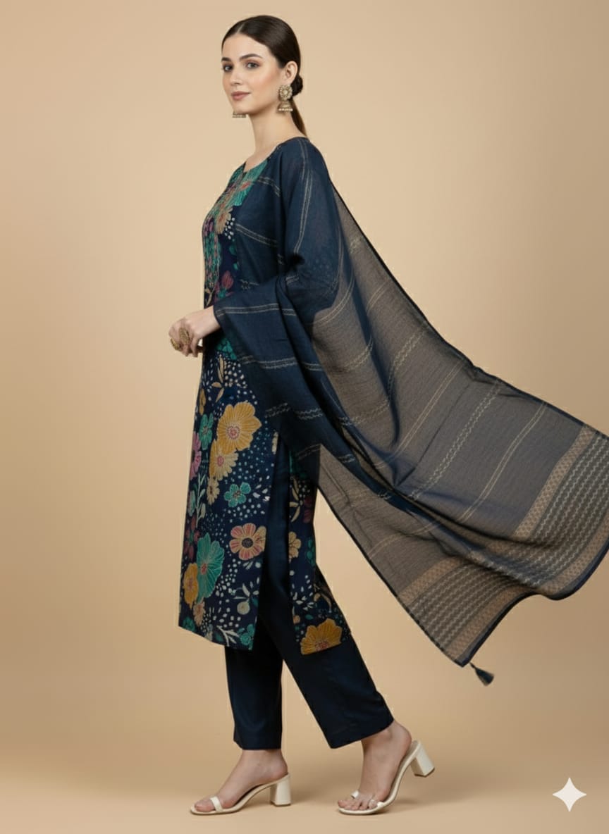 Faddism Floral Elegance Navy Blue Modal Silk Kurta Pant Dupatta Set