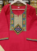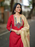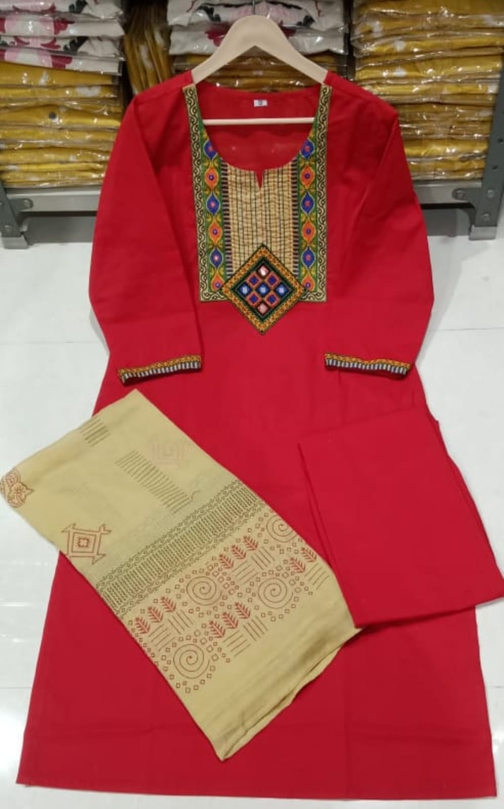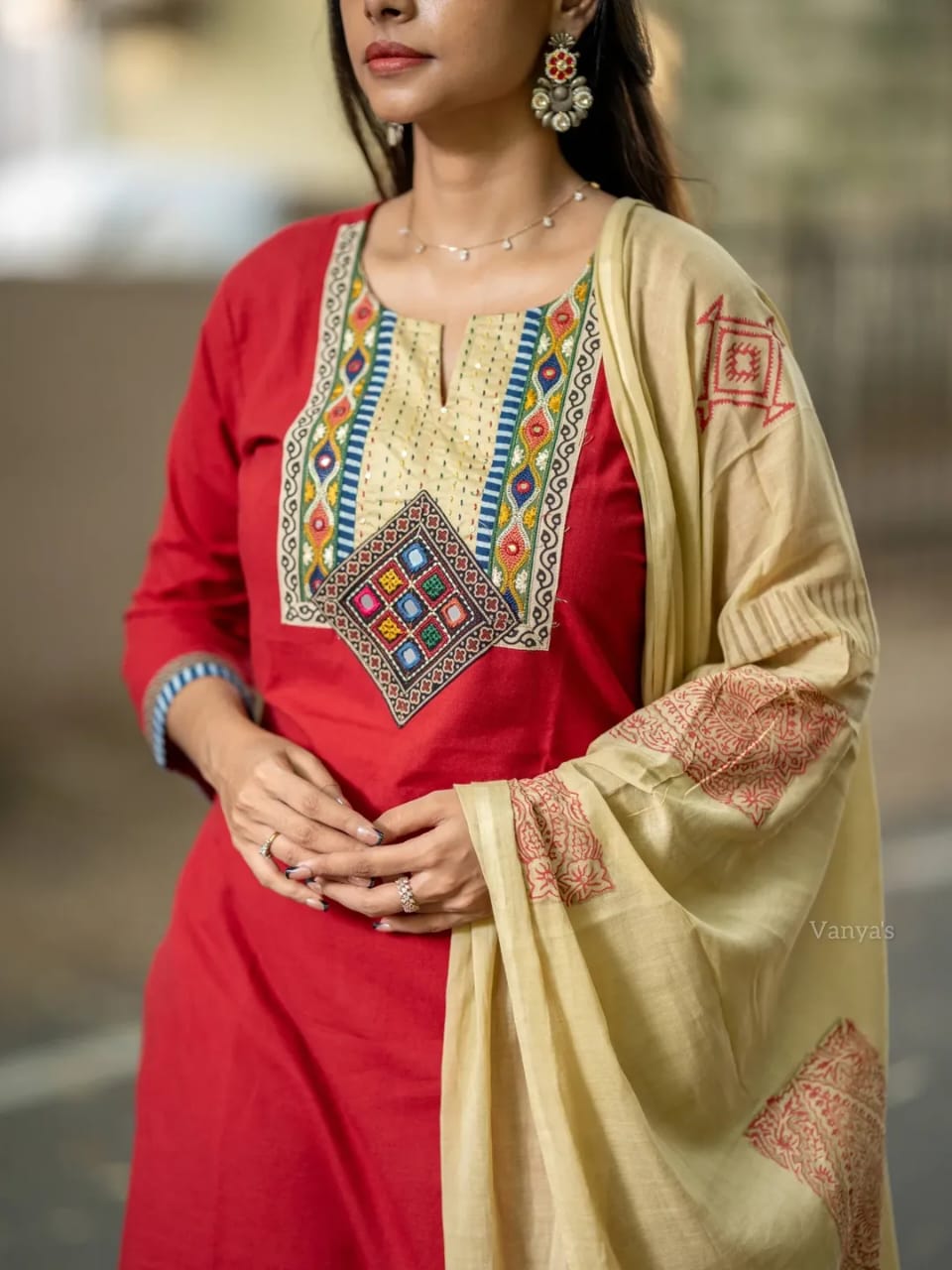 Make a refined style statement with this fashion-exclusive kurti pant set, thoughtfully crafted for timeless elegance. The solid red straight-cut cotton kurta is elevated with a beautifully patch-embroidered yoke inspired by traditional Kutch artistry, lending a rich handcrafted appeal.