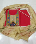 Fashion Exclusive Red Cotton Kurti Pant Set with Patch-Embroidered Yoke & Mulmul Dupatta