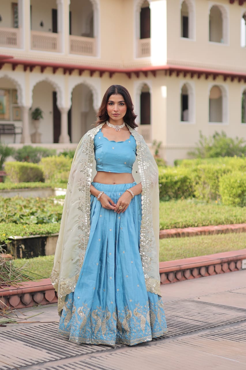 Turn heads with this stunning premium lehenga set made in rich gold crush fabric, adorned with intricate sequins and zari embroidery. Featuring a beautifully finished dupatta and canvas-stitched flare, this ensemble offers a perfect blend of glamour, comfort, and designer finesse.