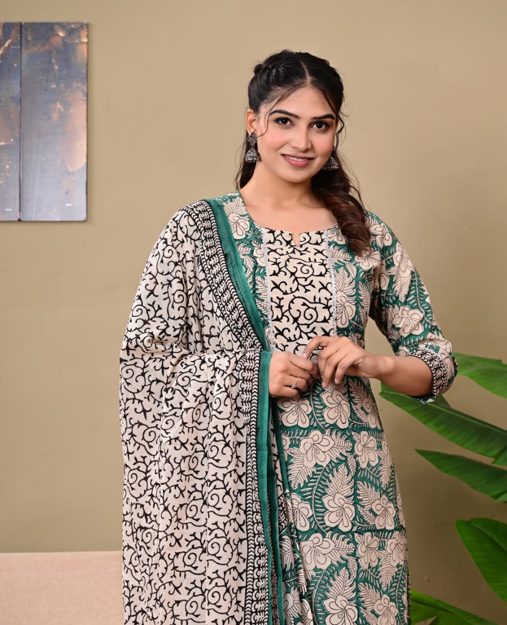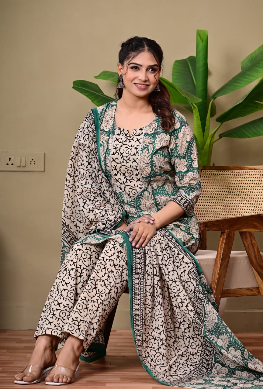 Hand Block Printed Stitched Cotton Suit Set with Matching Cotton Dupatta