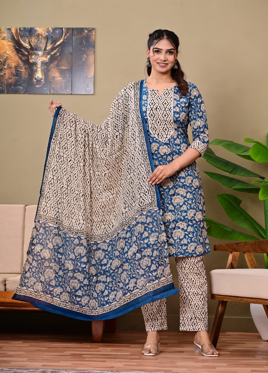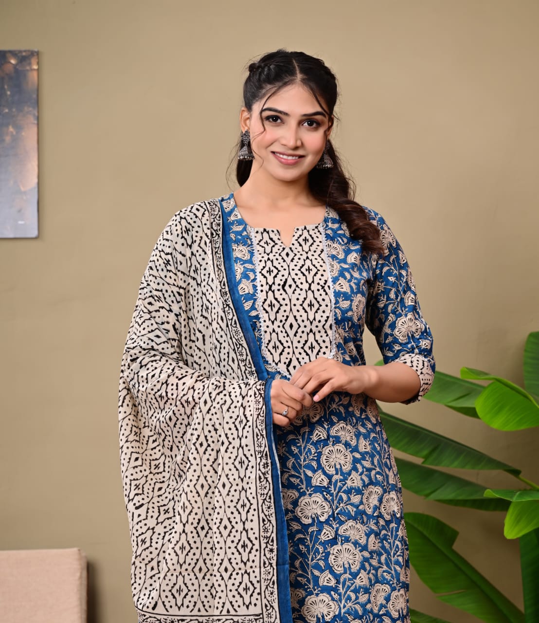 Hand Block Printed Stitched Cotton Suit Set with Matching Cotton Dupatta