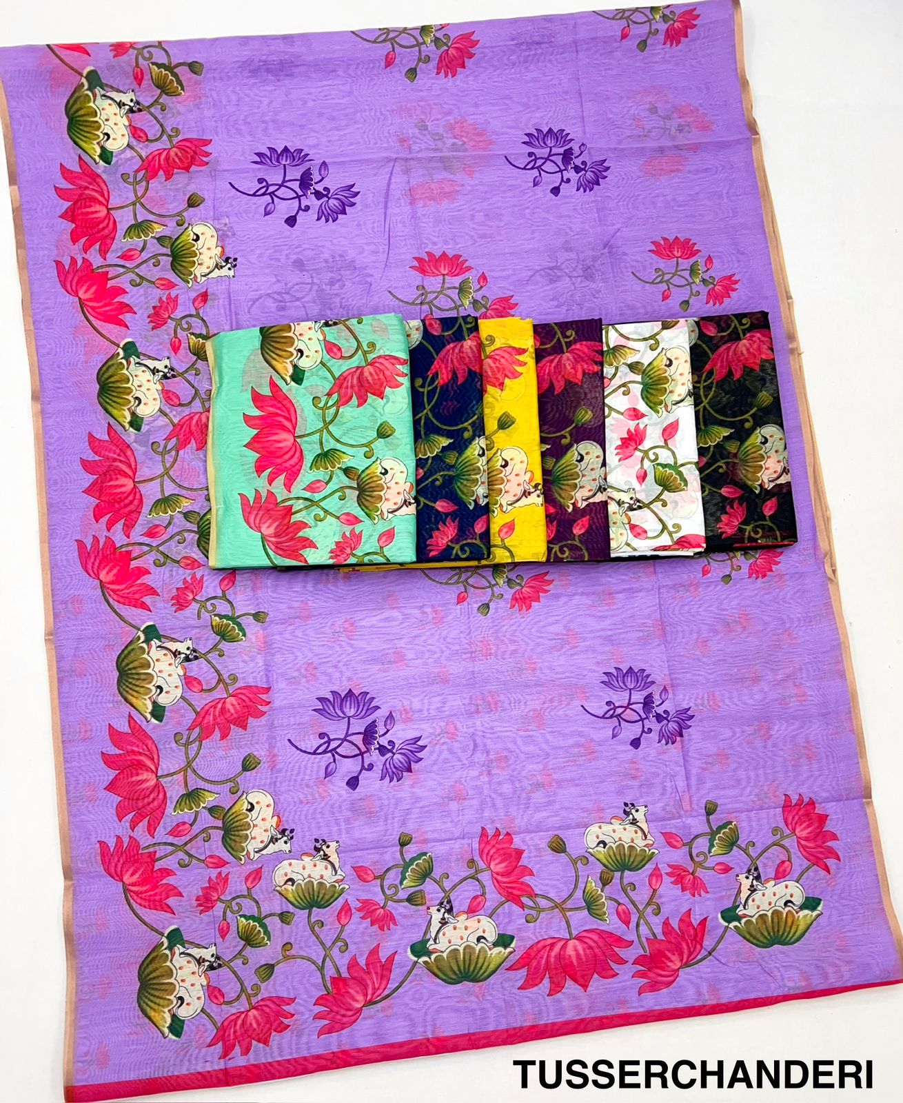 Inspired by timeless Pichwai artistry, this Kazari Series Tusser Chanderi saree blends traditional craftsmanship with elegant modern appeal. Crafted from rich Tusser Chanderi fabric, the saree showcases intricate Kalamkari-inspired prints enhanced with a finely woven border that adds depth and sophistication.