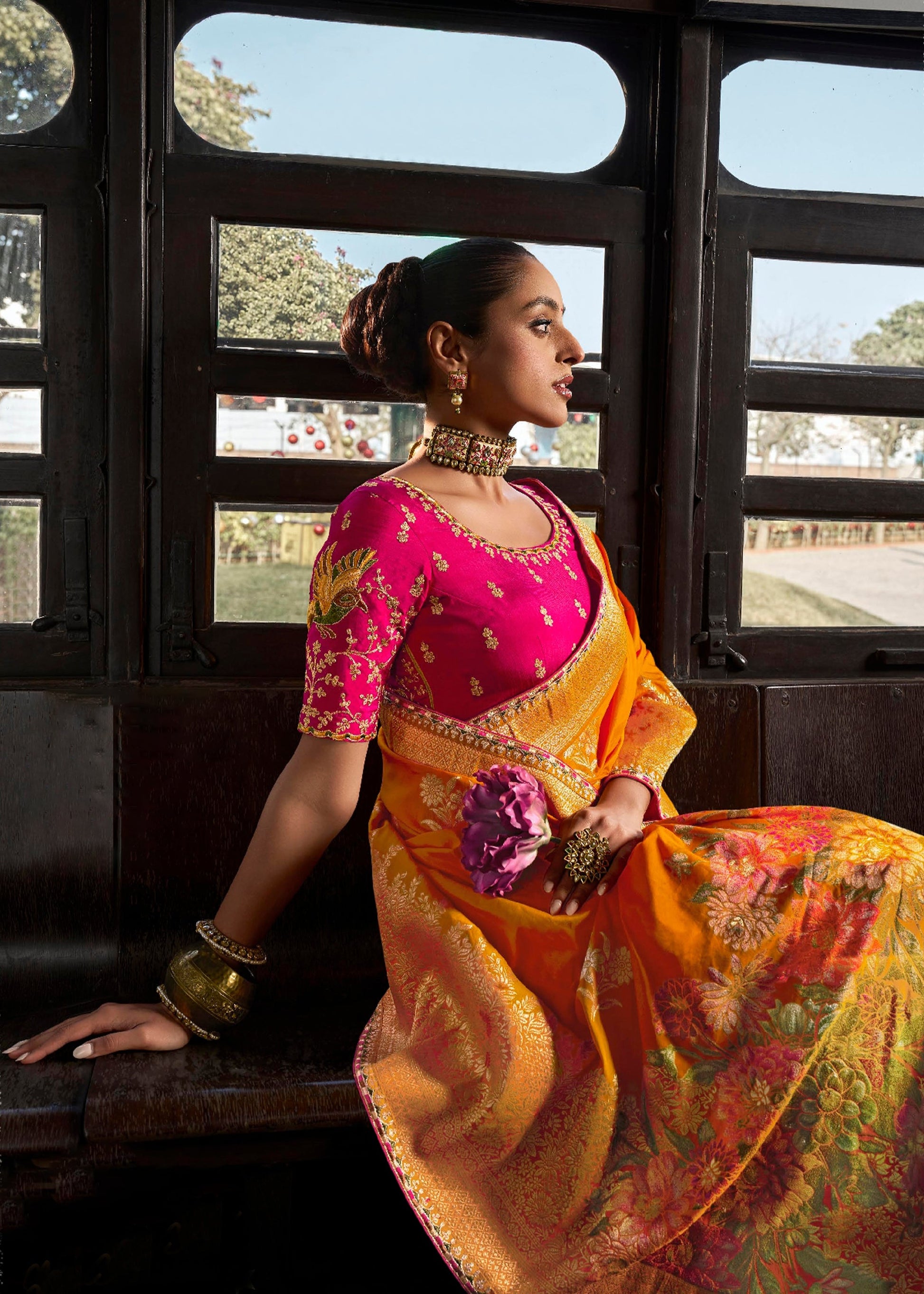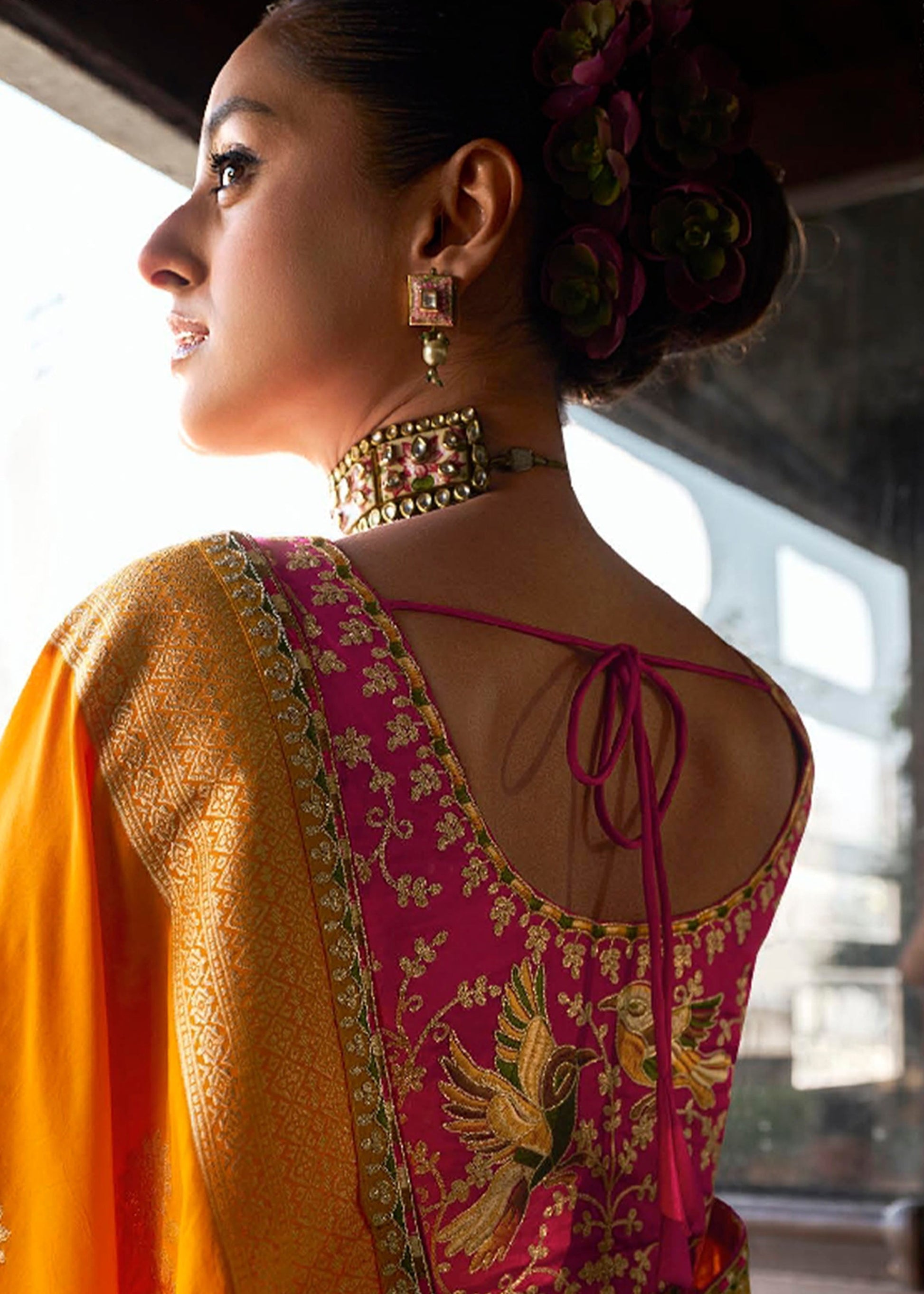 ✨ Heavy embroidered blouse in contrast hue completes the ensemble