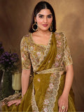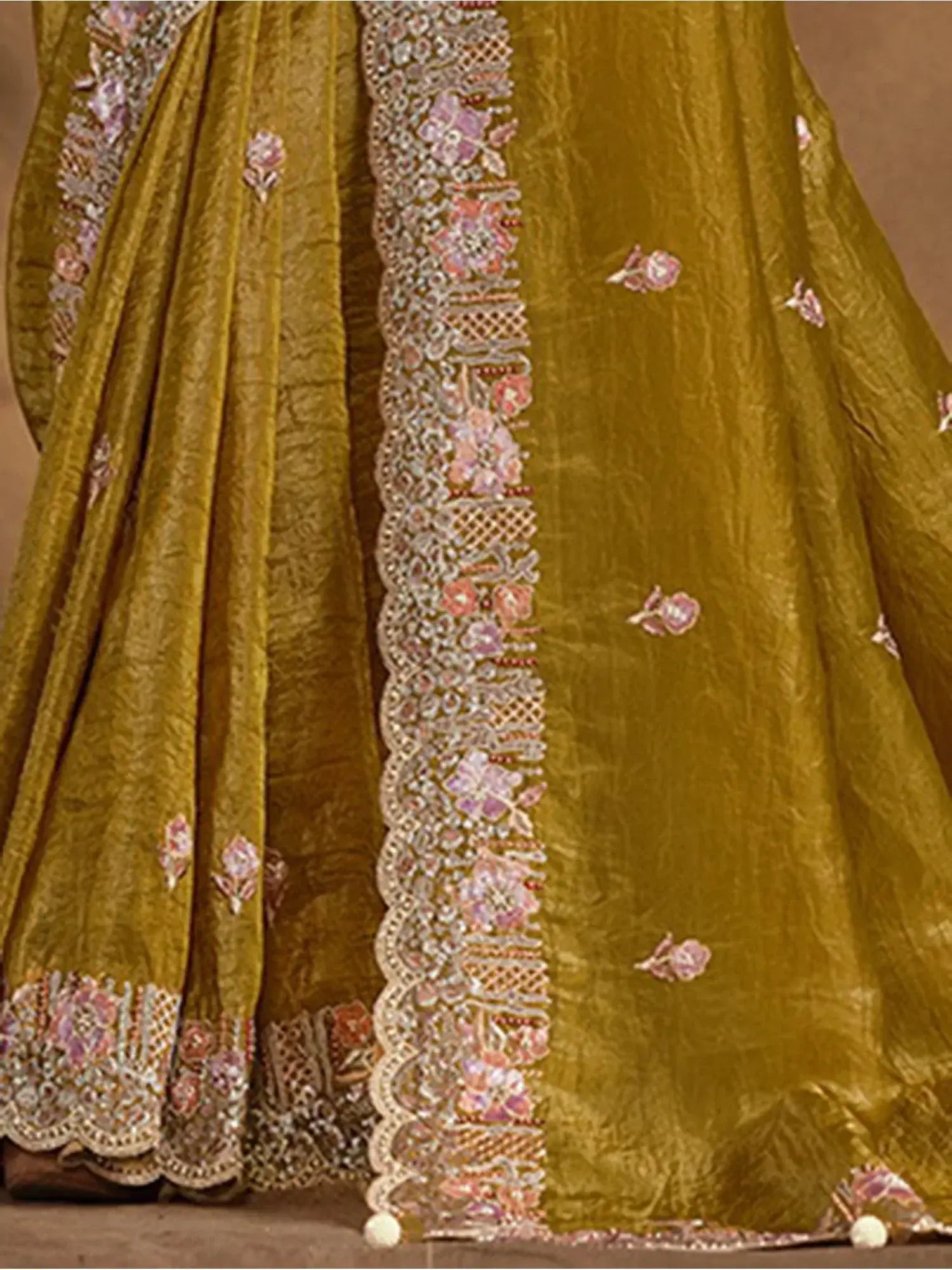 Mahotsav Flaxen Yellow Crush Paper Silk Saree with Pearl Work