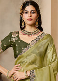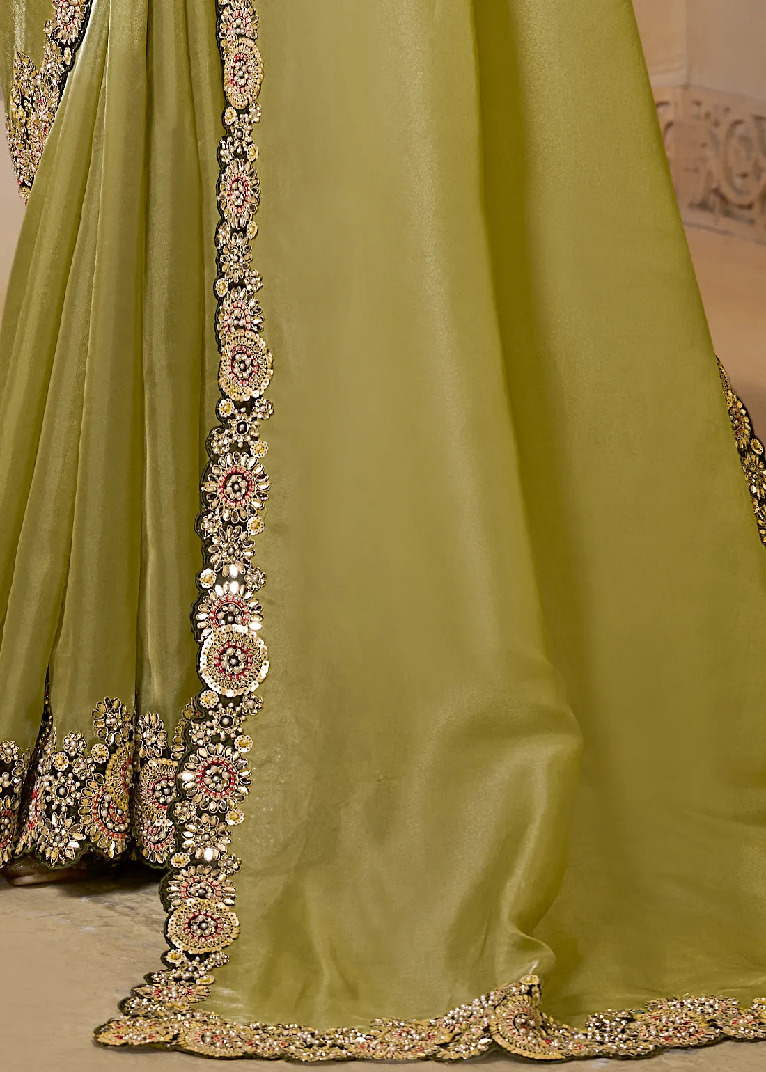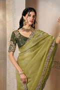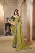 Mahotsav Olive Green Designer Silk Saree with Heavy Border & Contrast Blouse