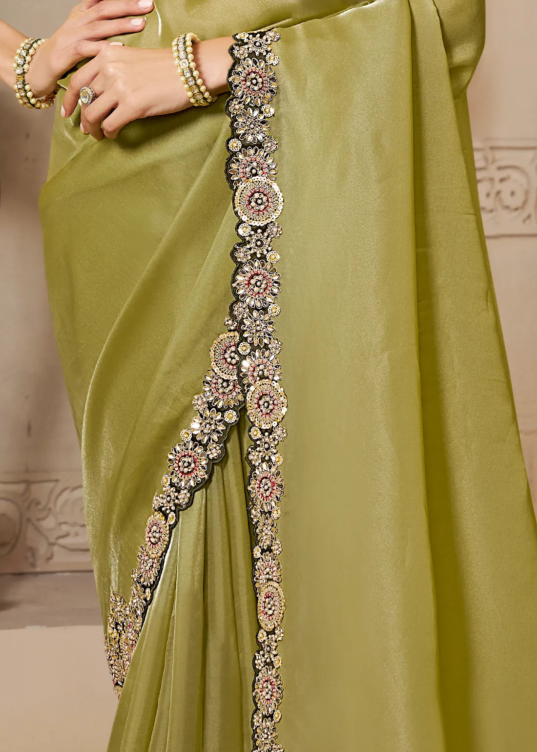 Drape yourself in sophistication with this Olive Green Designer Silk Saree, featuring a heavy embroidered border and a striking contrast blouse. Perfect for festive events, weddings, and elegant celebrations — this saree blends royal charm with timeless grace. 💚