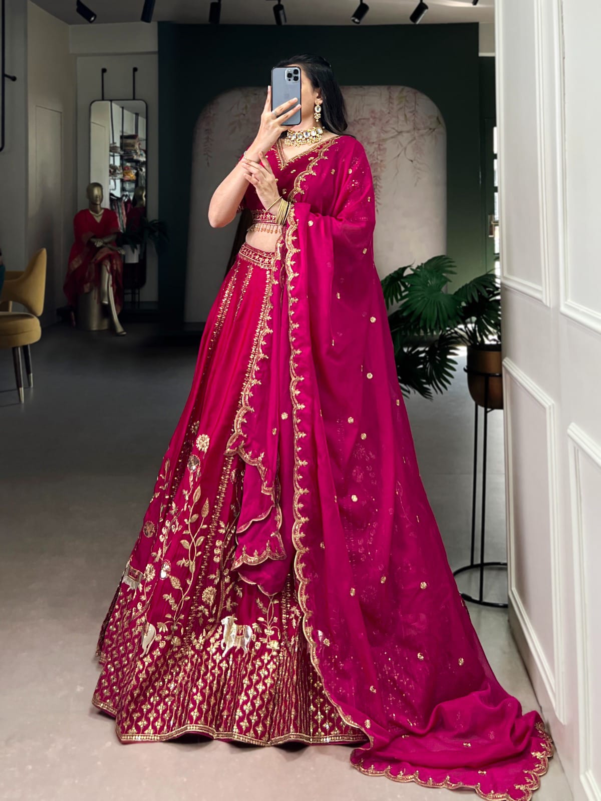 Step into the spotlight with this luxurious Pink Natural Silk Lehenga featuring rich sequins and thread embroidery. Paired with an elegant organza dupatta and beautifully embroidered blouse, this ensemble is crafted for grand wedding moments.