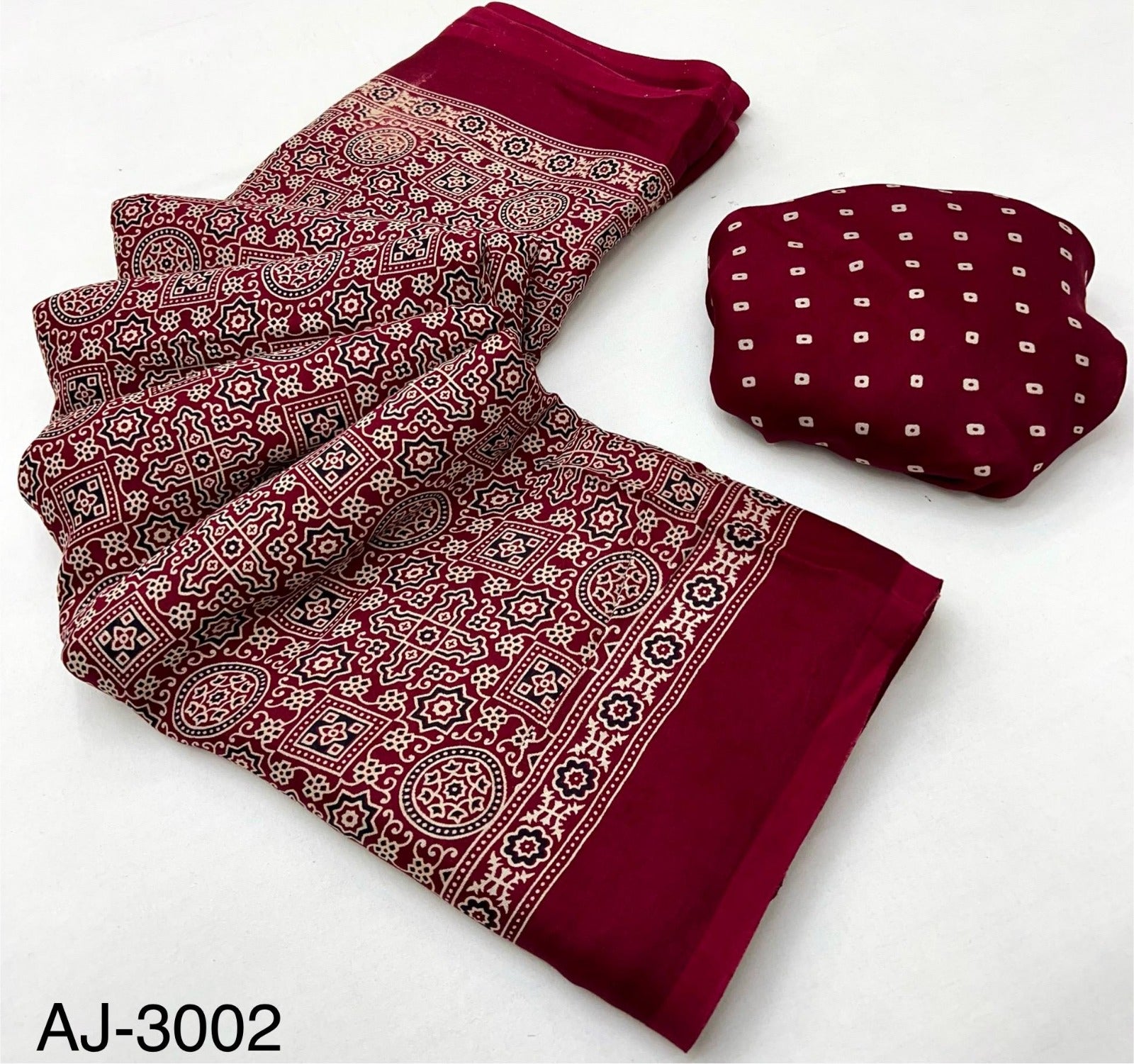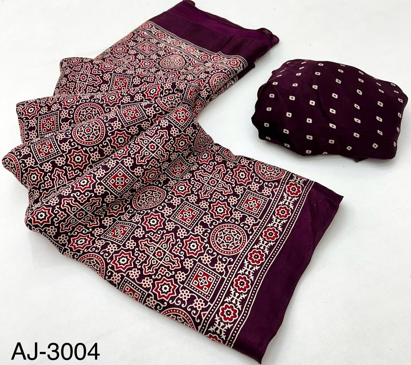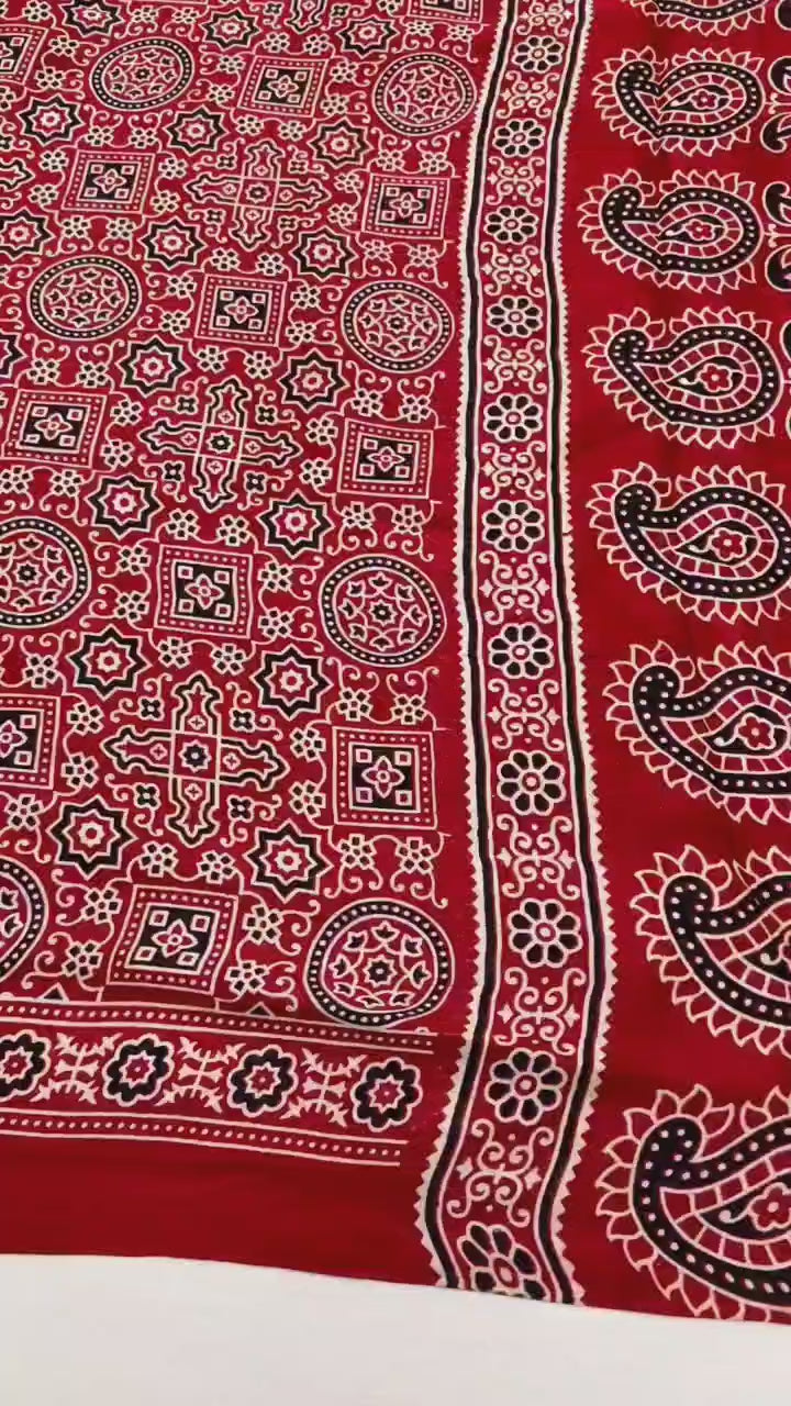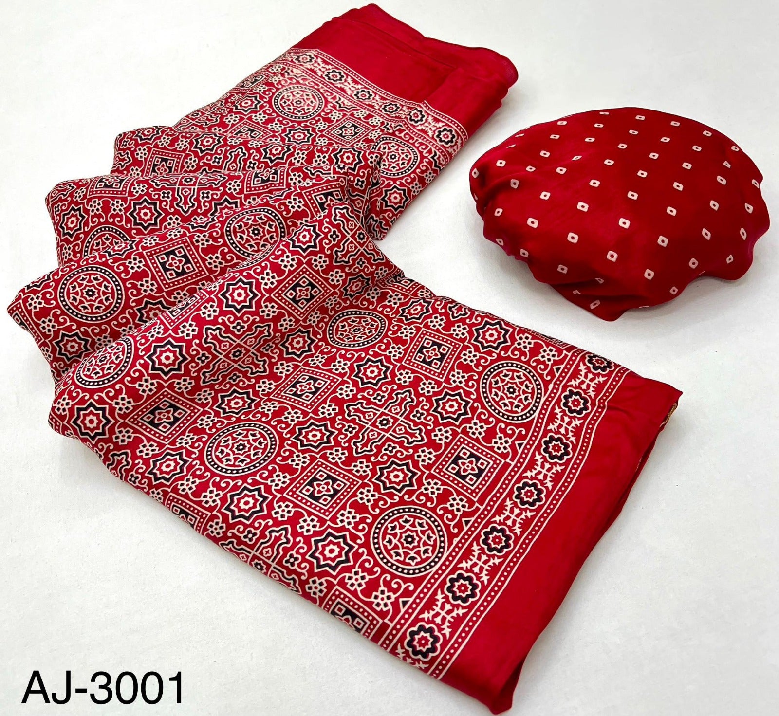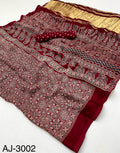 Experience the charm of timeless craftsmanship with our RajMata Ajrakh Saree. Made from pure modal fabric and adorned with traditional handblock Ajrakh prints and Lagadi Patta detailing, this saree offers unmatched elegance, comfort, and heritage appeal.