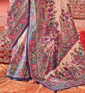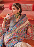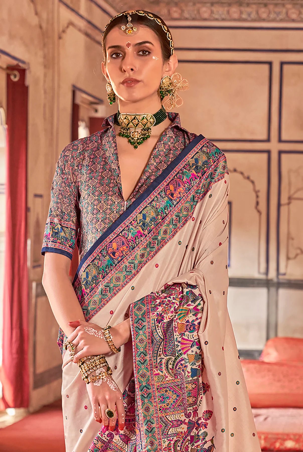 Introducing a refined Cream with Blue Woven masterpiece from Raj-Tilak Vol. 2 by KRESHVA, crafted for those who appreciate understated luxury with a royal accent. Woven in premium Super 801 P.V. Silk, this saree showcases elegant blue woven detailing that contrasts beautifully against a soft cream base. Enhanced with a rich glory finish, the fabric drapes fluidly while offering a smooth, lustrous texture.