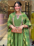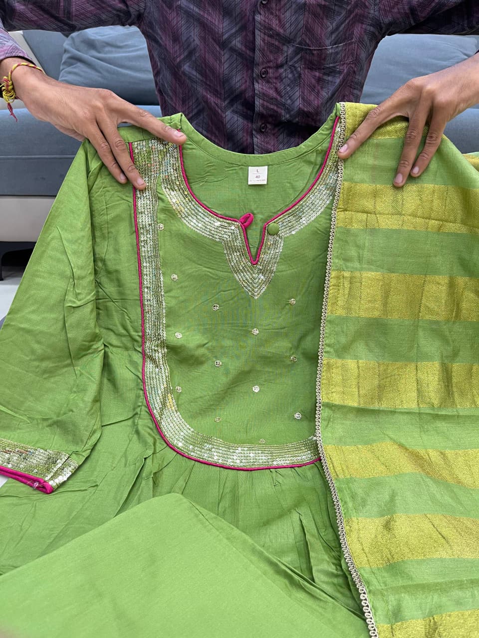 Elegance with this branded Maheshwari silk suit set, crafted in pure Mul Chanderi top with exquisite embroidery and sequin work on the neckline. Paired with a comfort-fit pant and a rich Banarasi jacquard dupatta, this ensemble is perfect for festive and special occasions.
