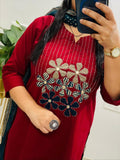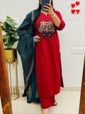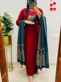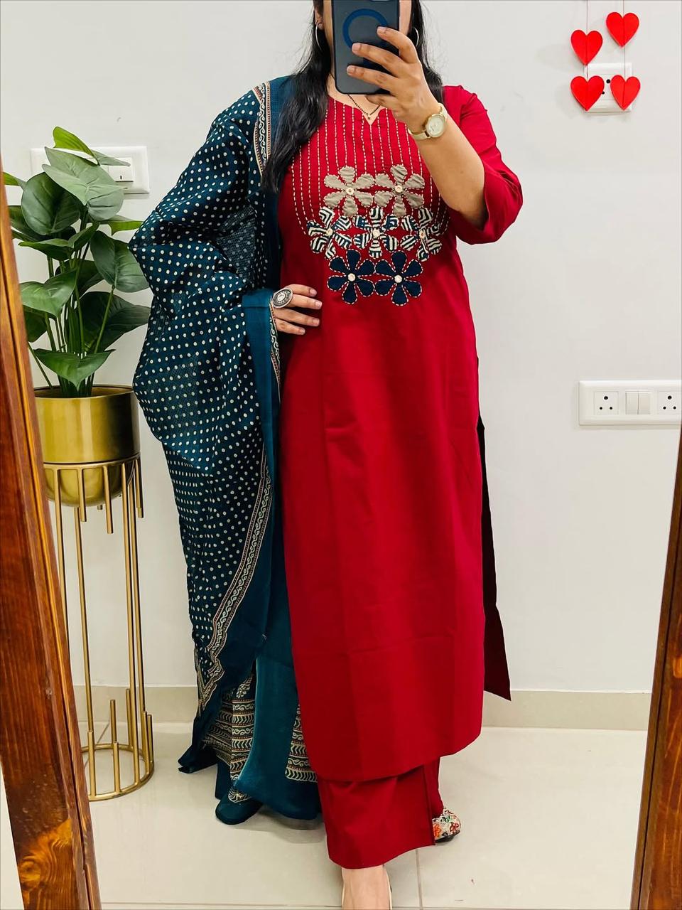 Pure Cotton Printed Kurti Set with Embroidery, Pant & Mulmul Dupatta |