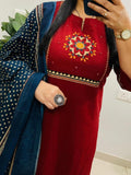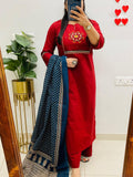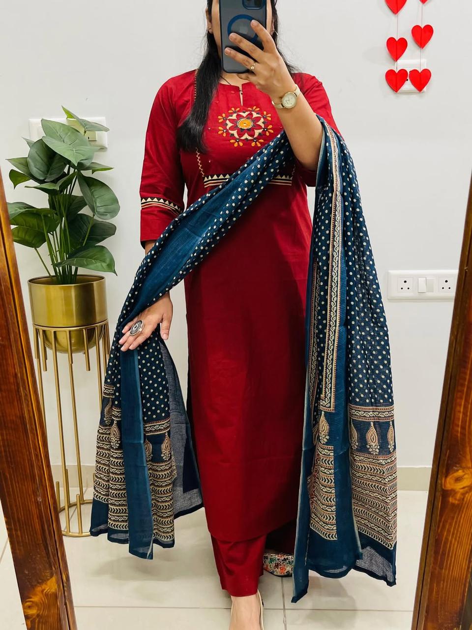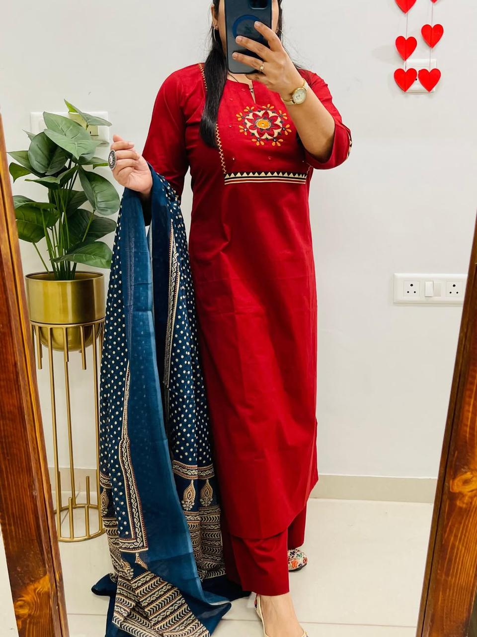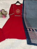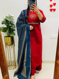 Pure Cotton Printed Kurti Set with Embroidery, Pant & Mulmul Dupatta