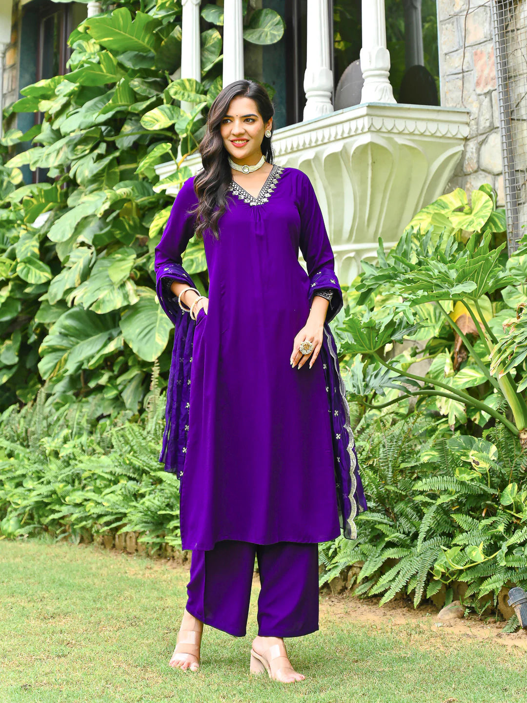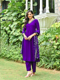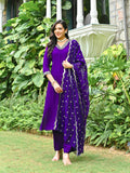 Turn heads with this purple embroidered kurta set, crafted in luxurious viscose rayon and paired with a flowy palazzo and a sheer organza dupatta. The fine embroidery adds a rich festive touch, while the lightweight dupatta gives the ensemble an ethereal finish. Perfect for weddings, festive events, or evening celebrations, this set brings together regal hues, comfort, and timeless elegance.