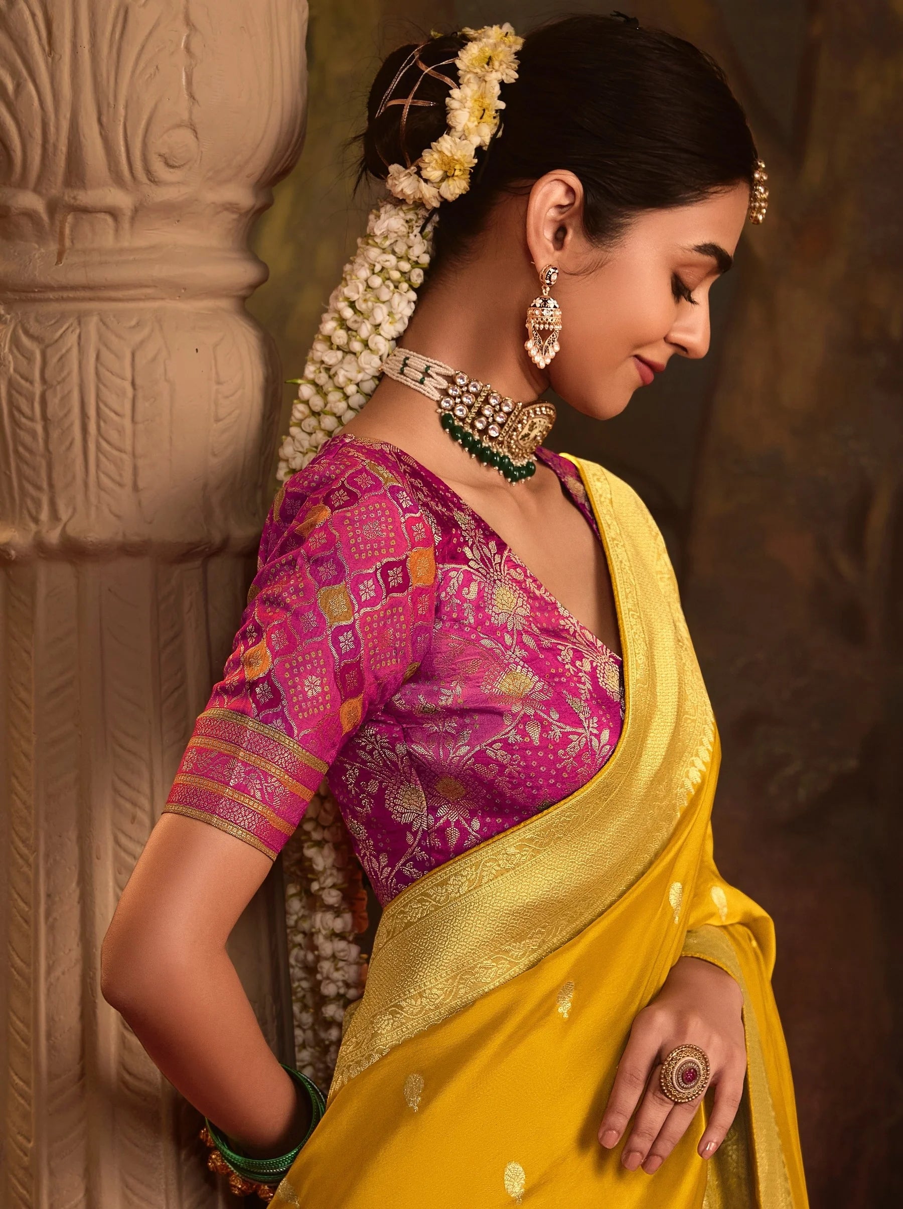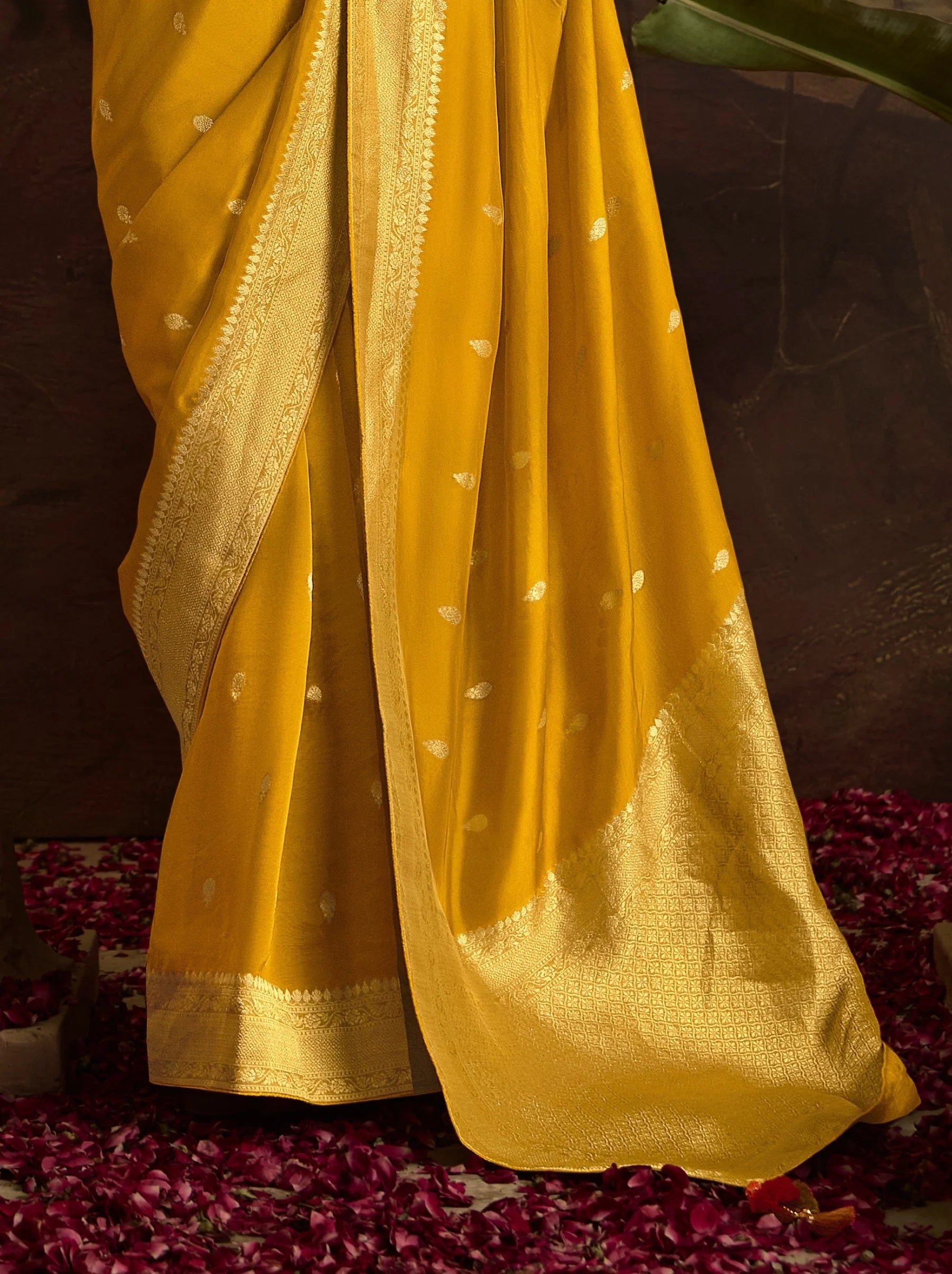 A stunning Honey Yellow Pure Crepe Dola Silk Saree from Kimora’s RAAS Catalog, featuring exquisite zari weaving and a premium Kora Silk blouse. Perfect for weddings, festivities, and special occasions.