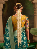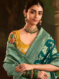 Elevate your festive elegance with this Teal Green Crepe Dola Silk Saree from Kimora’s RAAS catalog. Crafted in premium Kora Silk with luxurious zari weaving, this designer piece blends tradition with rich contemporary charm.