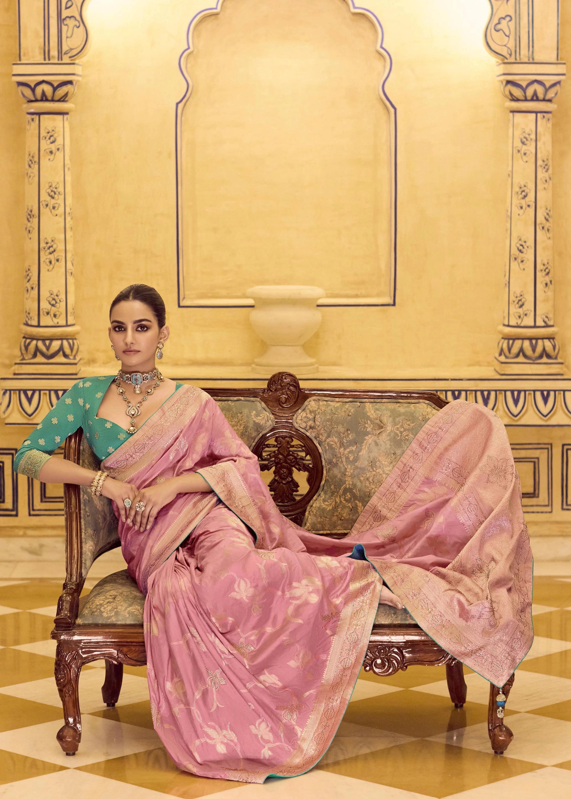 Step into a world of subtle royalty with this Pastel Pink Pure Banarasi Crepe Silk Saree from the prestigious RajMahal Collection by Kimora.
