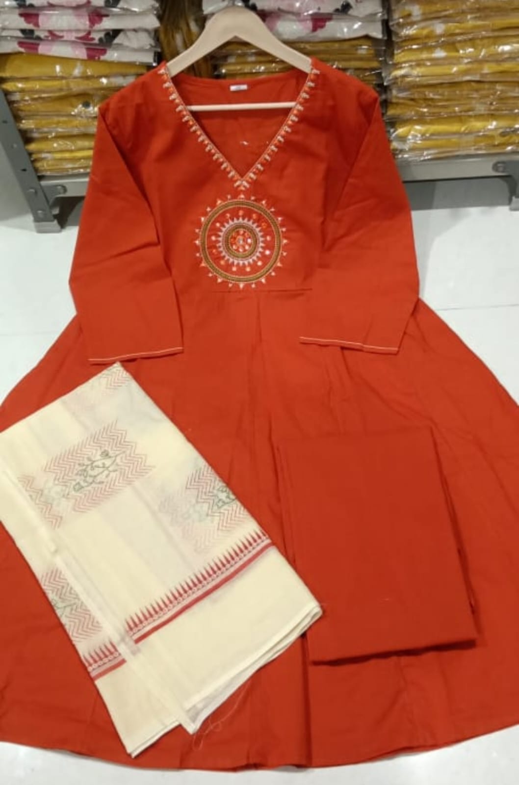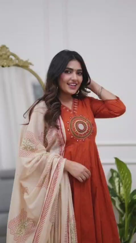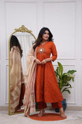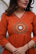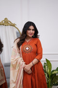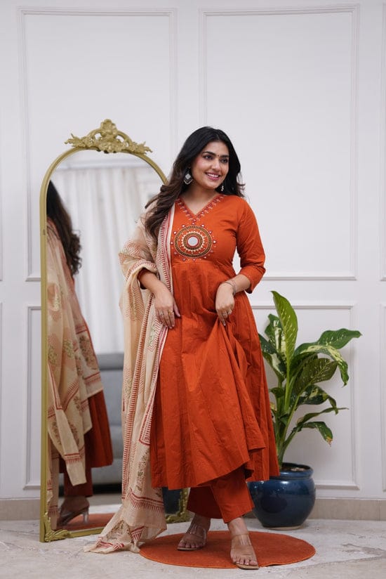 Rust Cotton Anarkali Kurta Pant Set with Mirror Work & Mal Cotton Dupatta