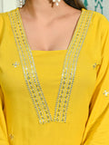 Radiate festive charm in this yellow embroidered kurta set, beautifully crafted from viscose rayon. The delicate embroidery lends an elegant ethnic touch, while the smooth fabric ensures both comfort and sophistication. Perfect for festive gatherings, family occasions, or cultural celebrations, this kurta set brings a blend of tradition and modern grace to your wardrobe.