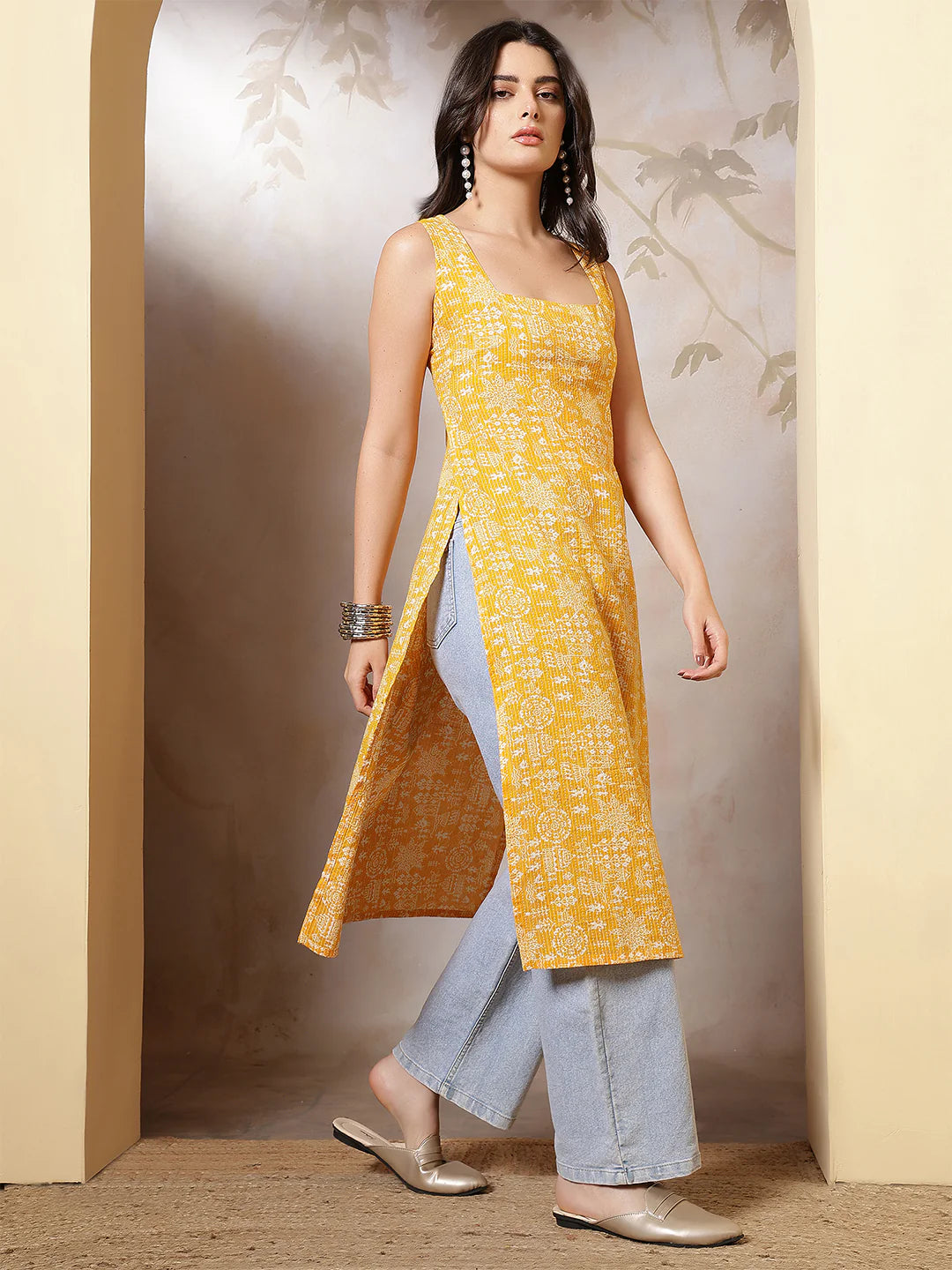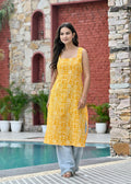Brighten your ethnic wardrobe with this cheerful yellow printed kurta. Made from soft, breathable pure cotton, the straight-fit kurta features a sleeveless design, calf-length hem, and side slits for a relaxed, comfortable fit. Perfect for casual outings, office wear, or festive day events, this kurta effortlessly blends traditional charm with modern ease.
